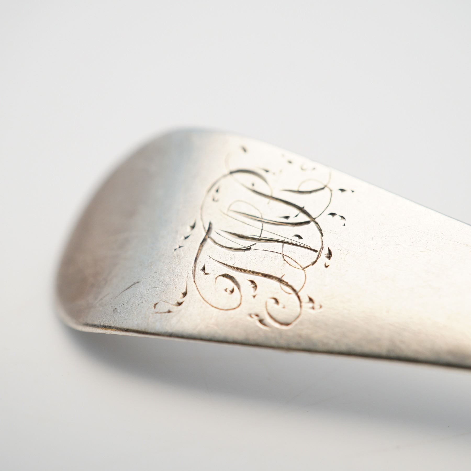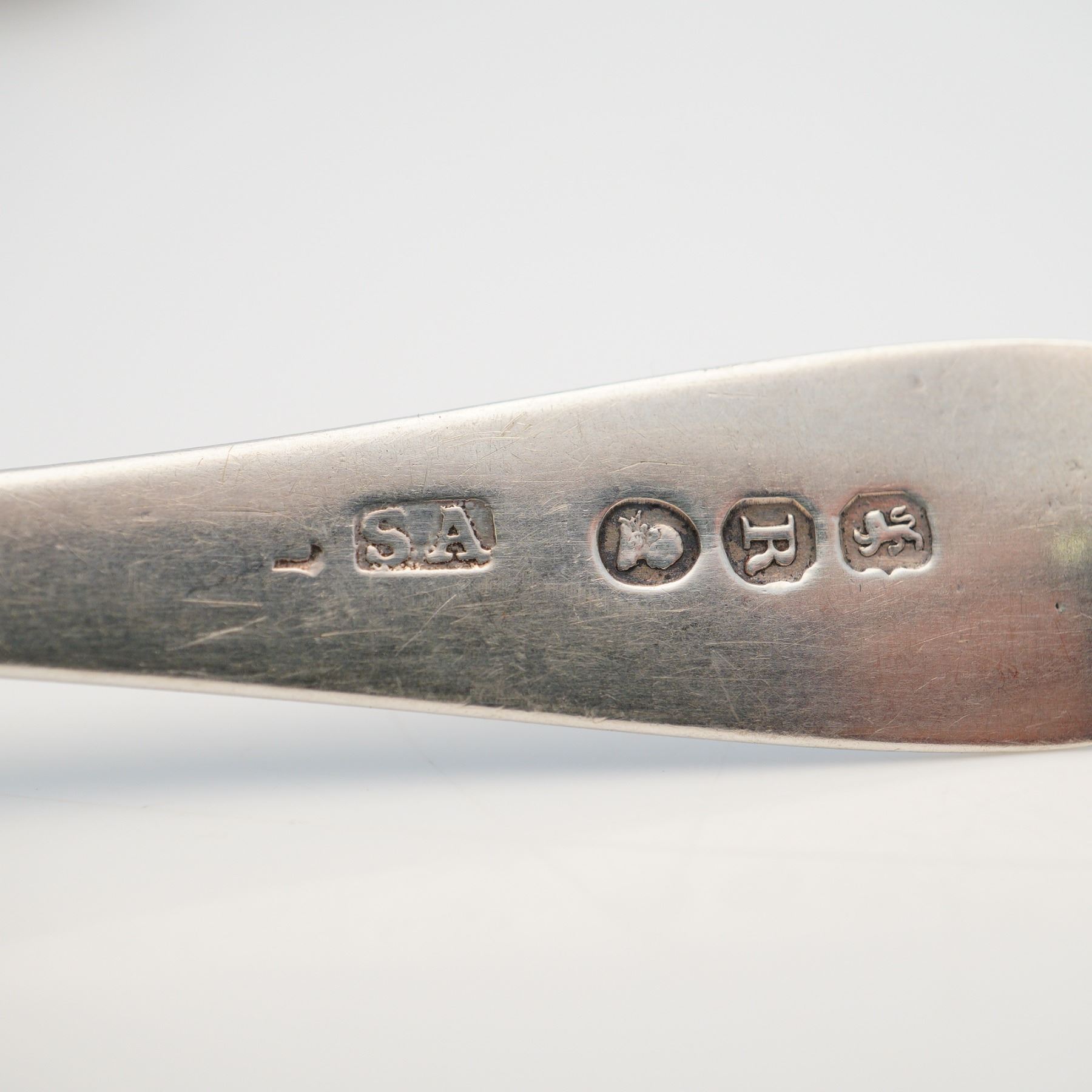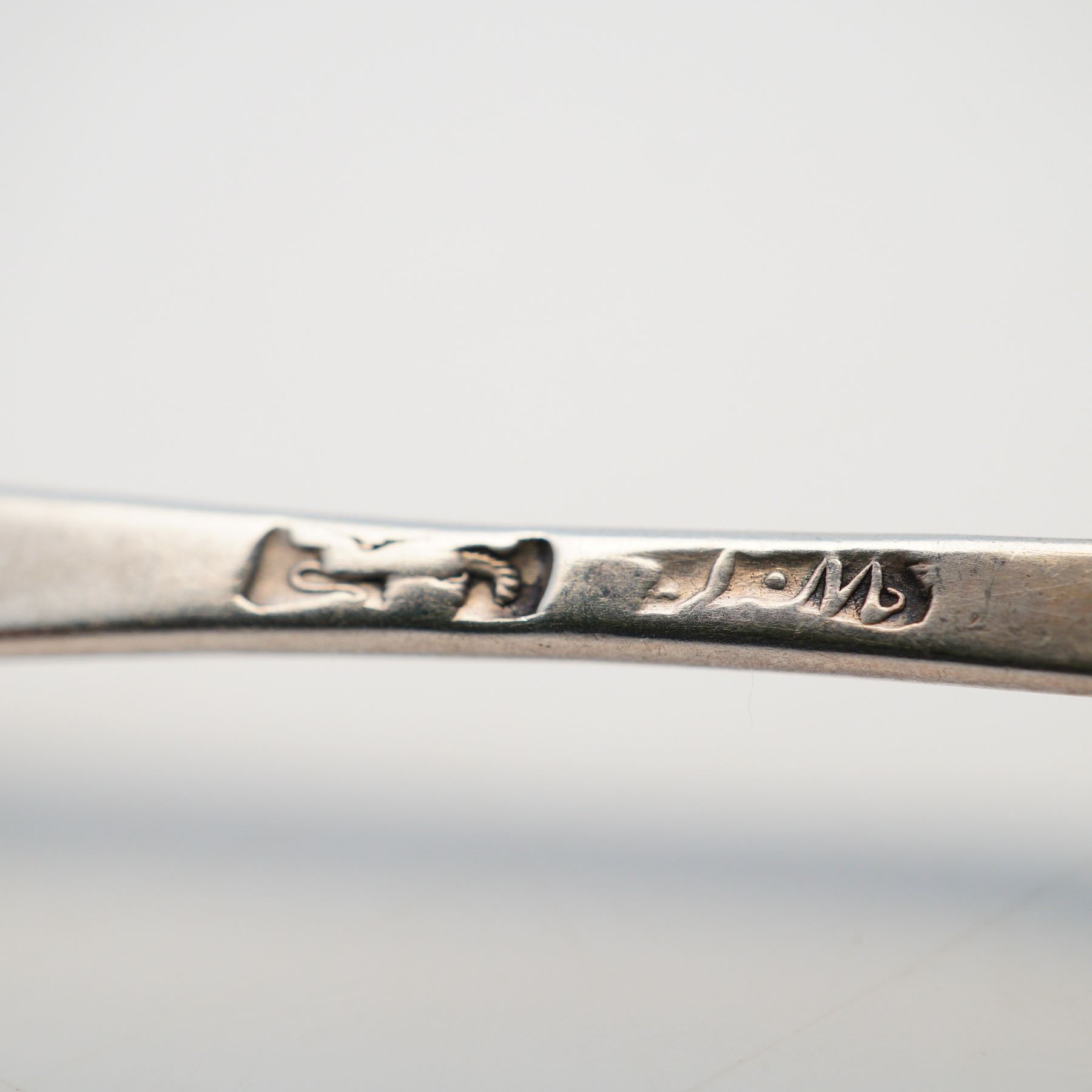 A fine group of seven antique sterling silver teaspoons, each featuring traditional Fiddle pattern handles and varying engraved monograms. The collection includes examples with clear British hallmarks denoting sterling standard (.925) silver, with makers' marks such as S.A. and I.M. visible, alongside assay marks consistent with 19th-century English production in London. The spoons display the lion passant for sterling purity, and additional marks indicating the city of assay and date letters typical of the period. Each spoon exhibits gentle wear and patina consistent with age and use, enhancing their antique charm. The group together weighs 94 grams, offering both decorative and collectible appeal. These spoons would make a handsome addition to any silver collection or an elegant touch to a period dining setting.