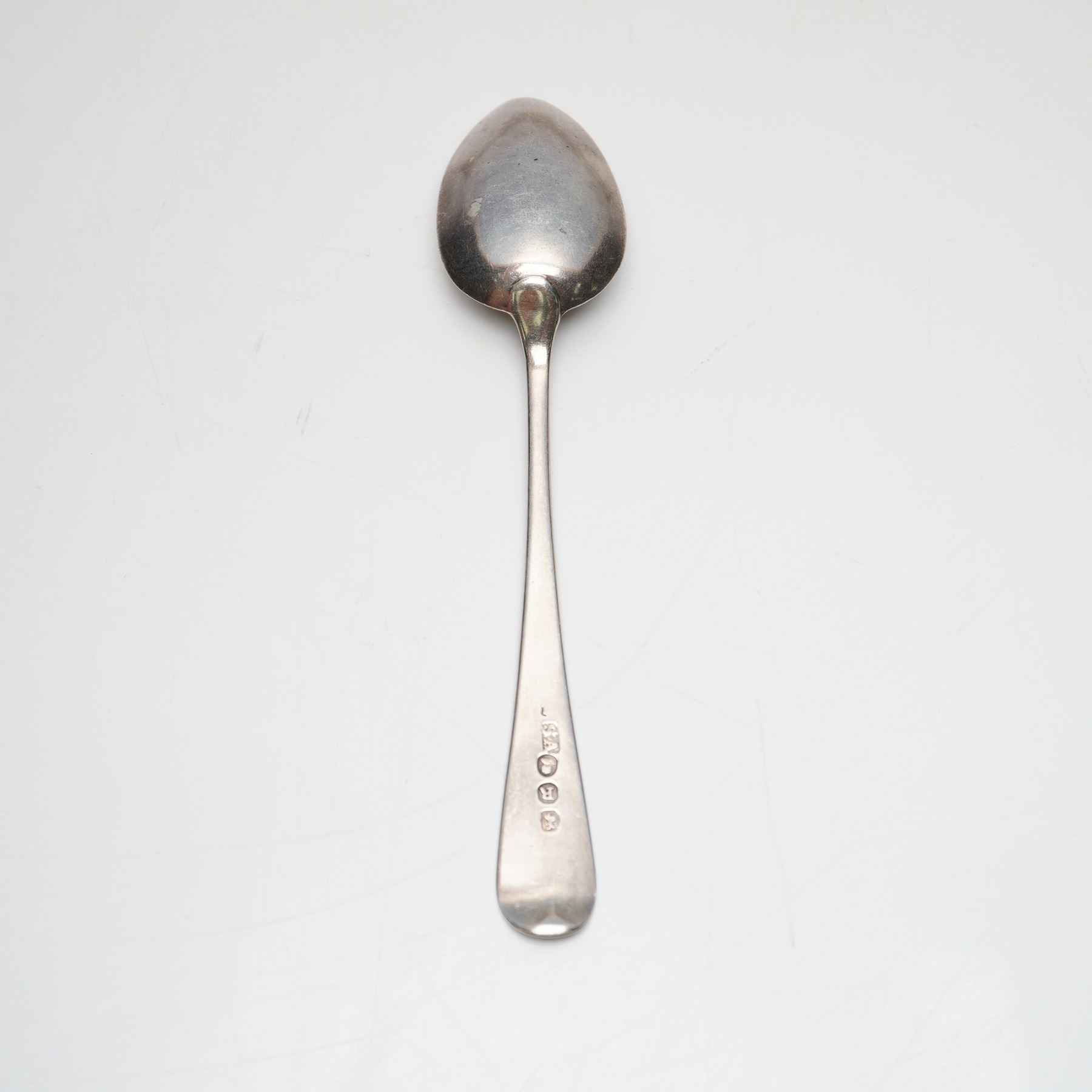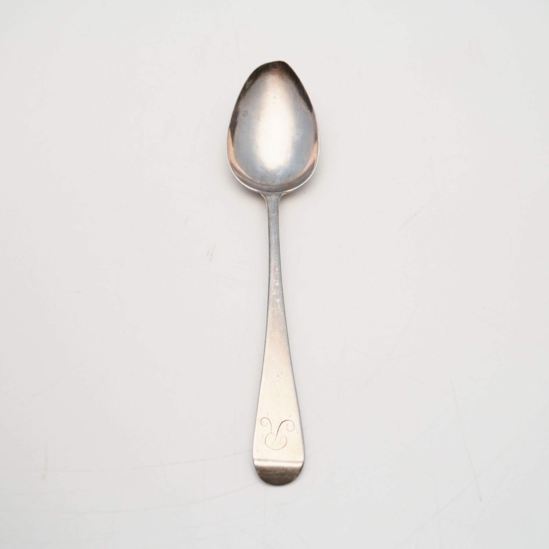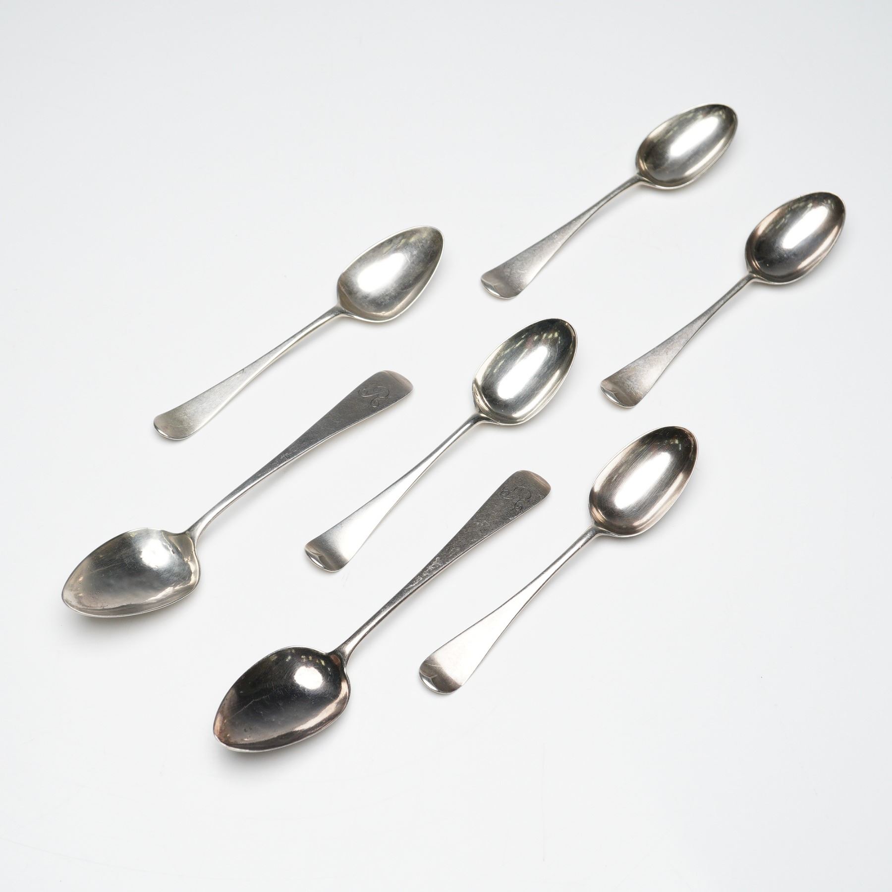 A fine group of seven antique sterling silver teaspoons, each featuring traditional Fiddle pattern handles and varying engraved monograms. The collection includes examples with clear British hallmarks denoting sterling standard (.925) silver, with makers' marks such as S.A. and I.M. visible, alongside assay marks consistent with 19th-century English production in London. The spoons display the lion passant for sterling purity, and additional marks indicating the city of assay and date letters typical of the period. Each spoon exhibits gentle wear and patina consistent with age and use, enhancing their antique charm. The group together weighs 94 grams, offering both decorative and collectible appeal. These spoons would make a handsome addition to any silver collection or an elegant touch to a period dining setting.