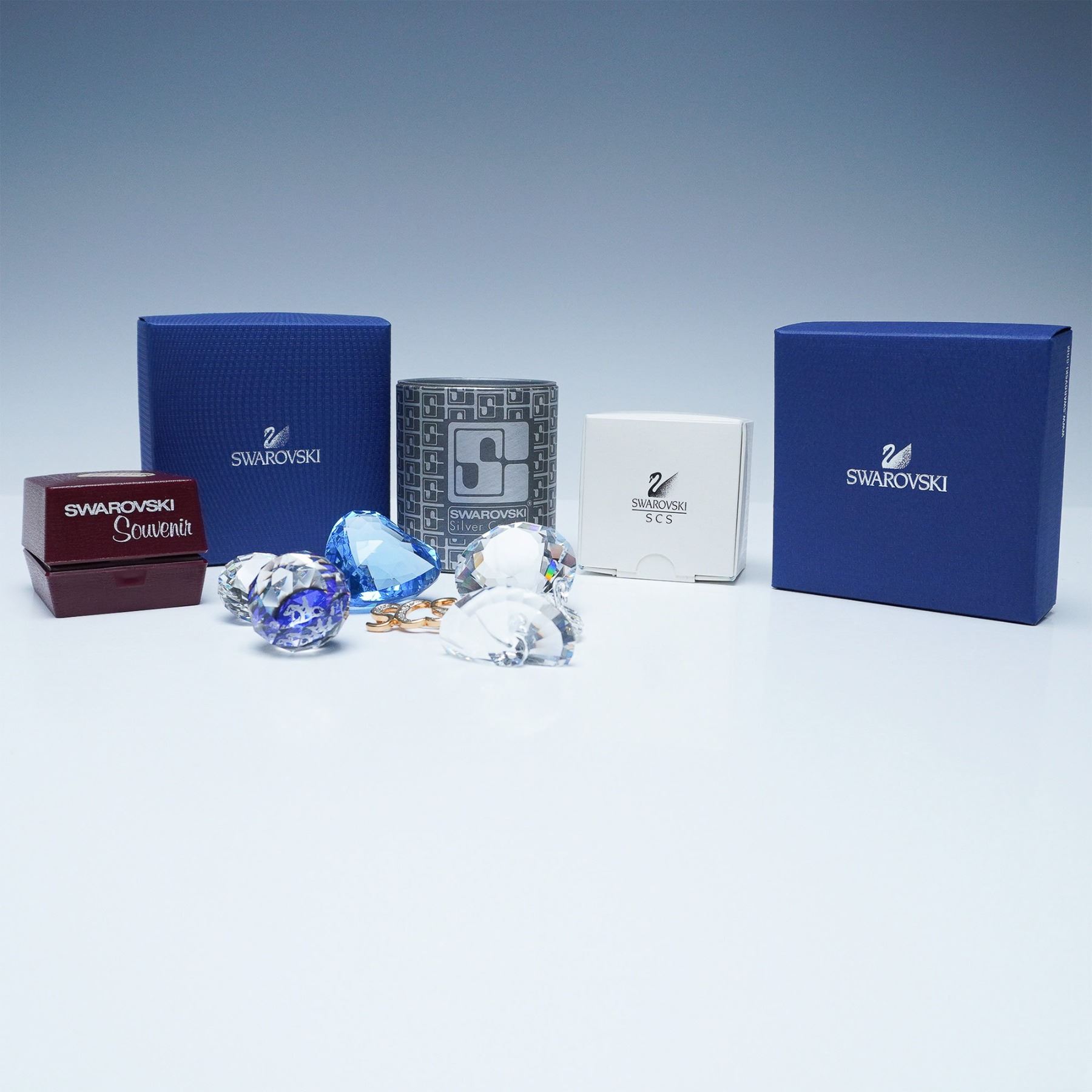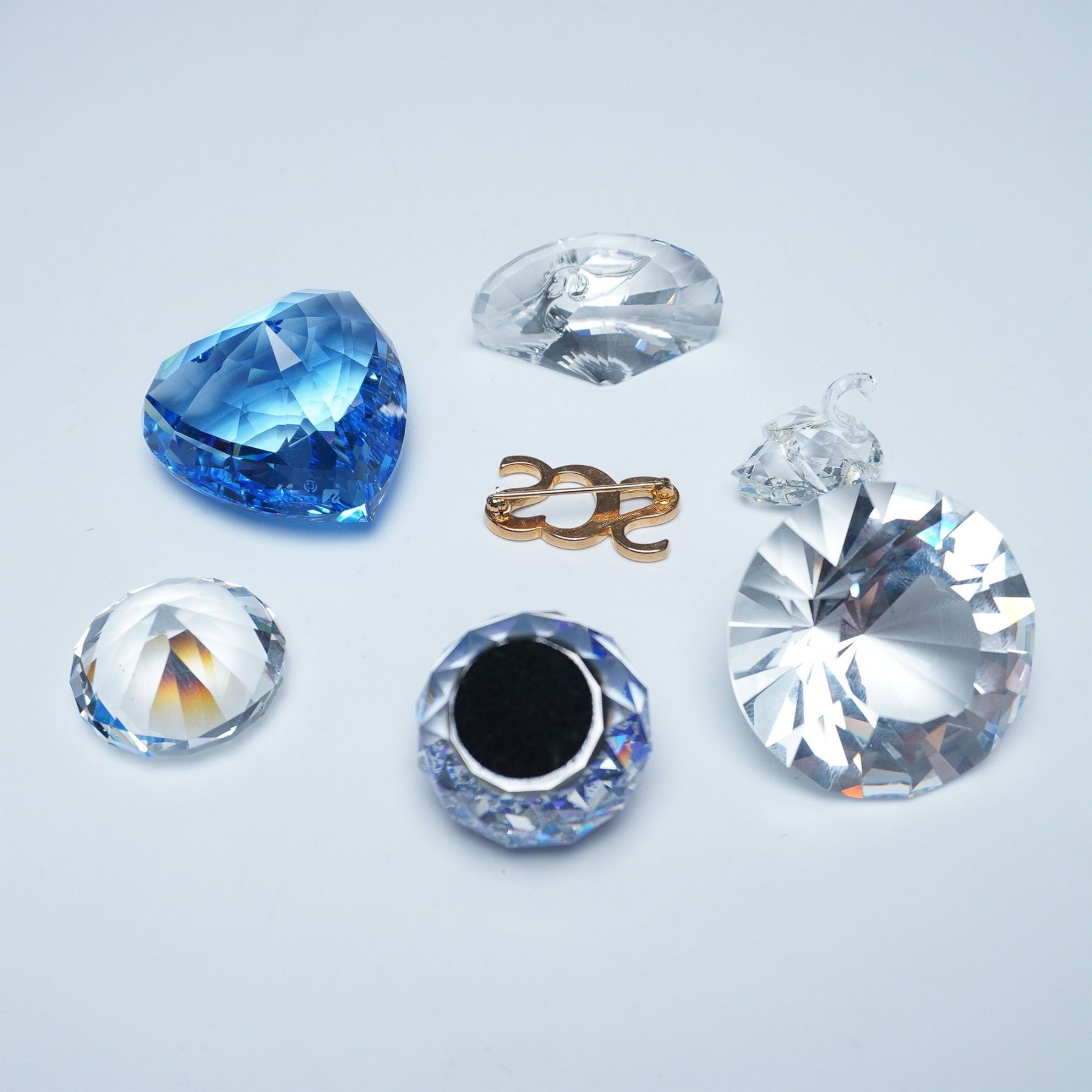 A stunning assortment of Swarovski crystal collectibles, including a variety of faceted crystal pieces. This lot features several dazzling items, including a large blue faceted heart, clear faceted rounds, and additional crystal designs. The collection also includes an SCS pin with gold-tone finish and embedded Swarovski crystals. Each piece showcases Swarovski's precision-cut crystal craftsmanship and signature brilliance. Some items come with their original packaging, enhancing their collectible appeal. Sizes range from 1" to 2.5".