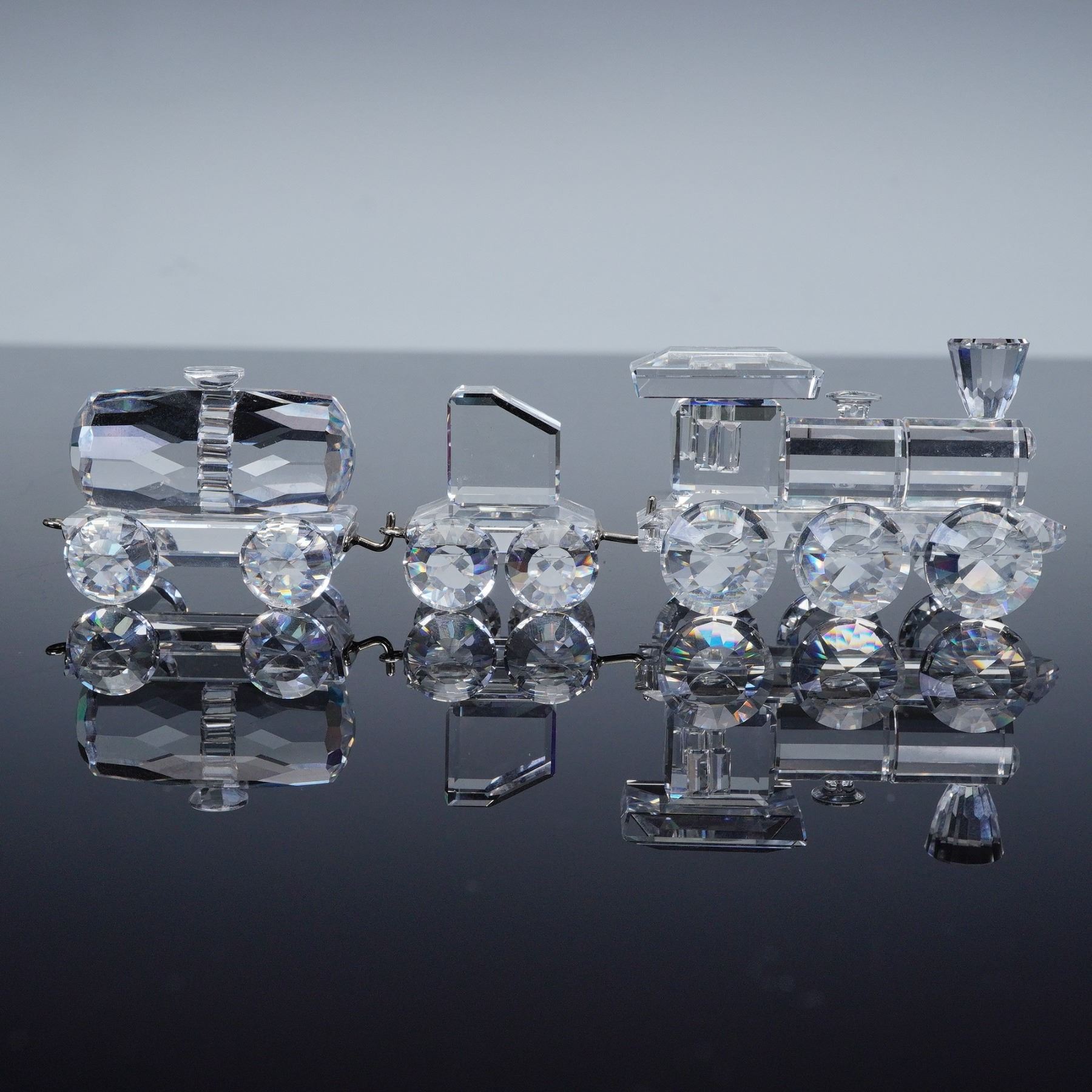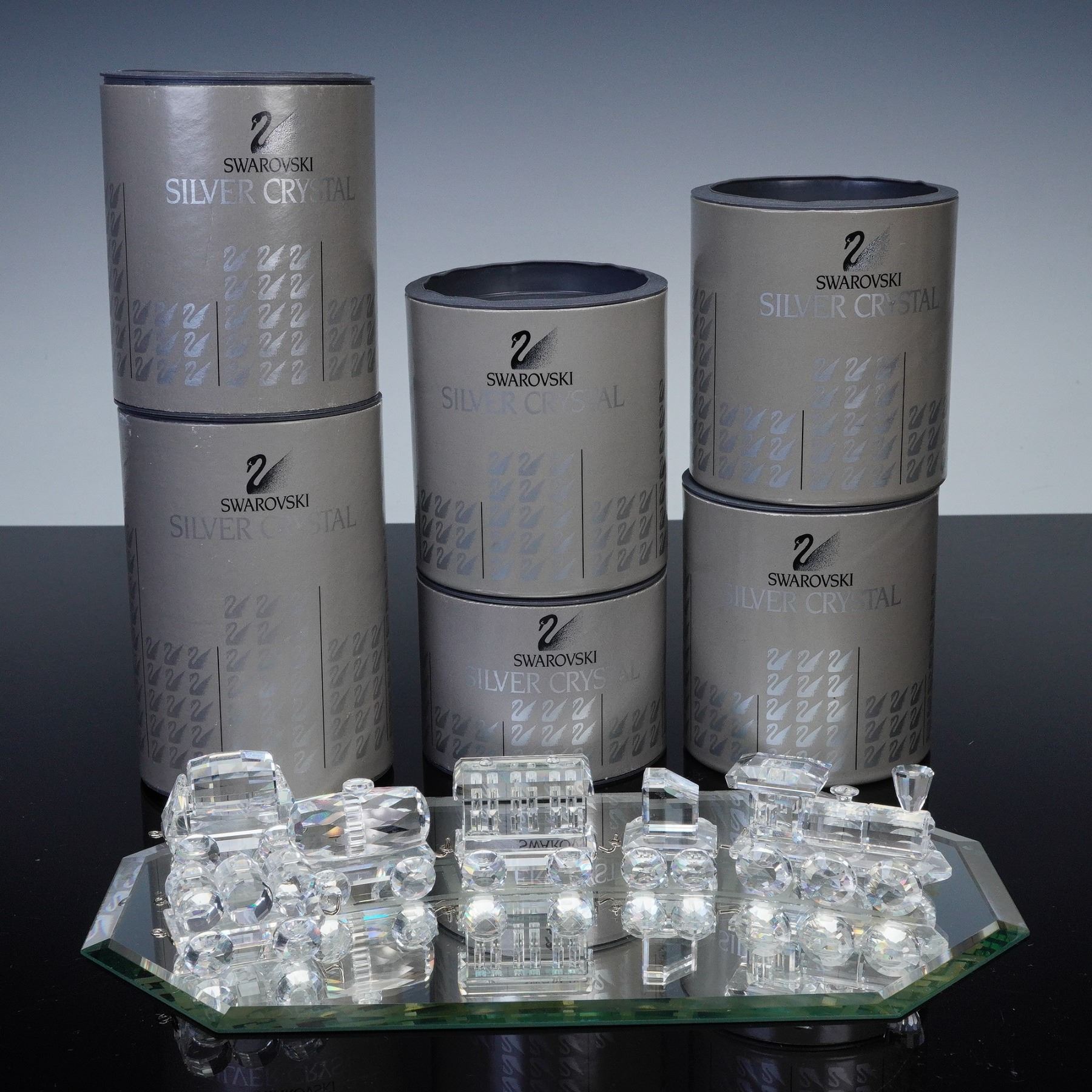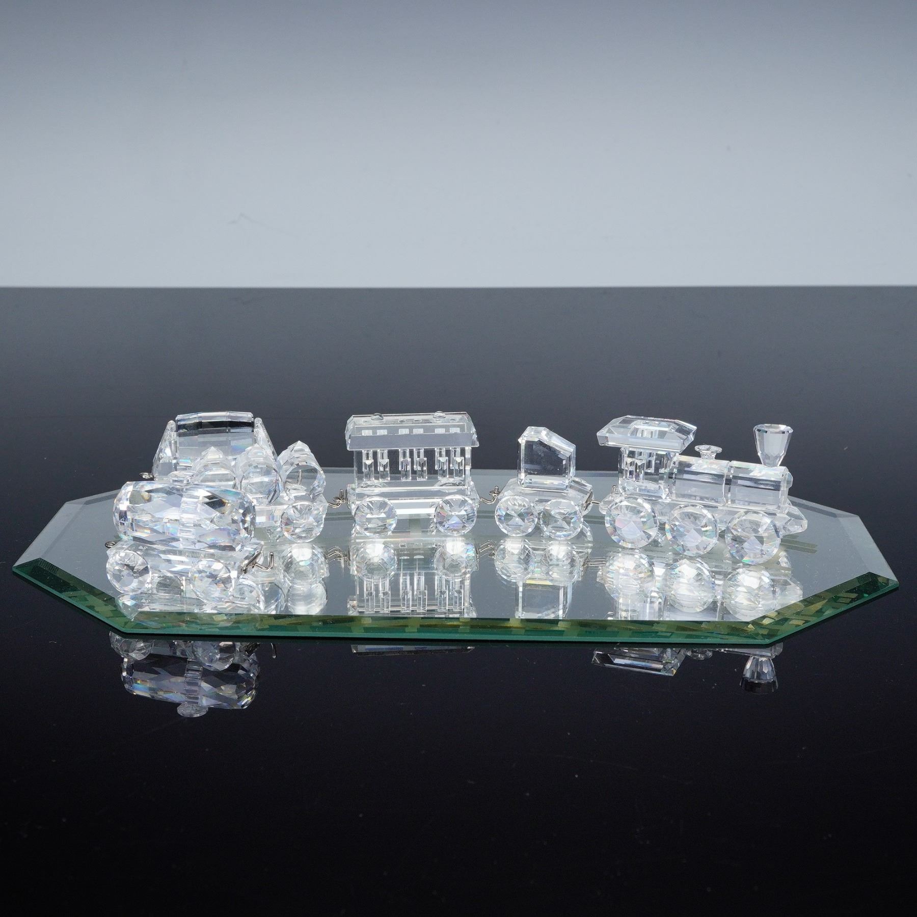 Complete Swarovski Silver Crystal Express train set including the locomotive, tender car, passenger carriage, petrol wagon, tipping wagon, and tank wagon, displayed on a mirrored track base. Each crystal piece is finely detailed with faceted surfaces that capture the light beautifully, and all bear the Swarovski swan logo hallmark. Every train piece is accompanied by its original box, while the mirror track base is included without a box. A sought after collector's set showcasing Swarovski craftsmanship and design.