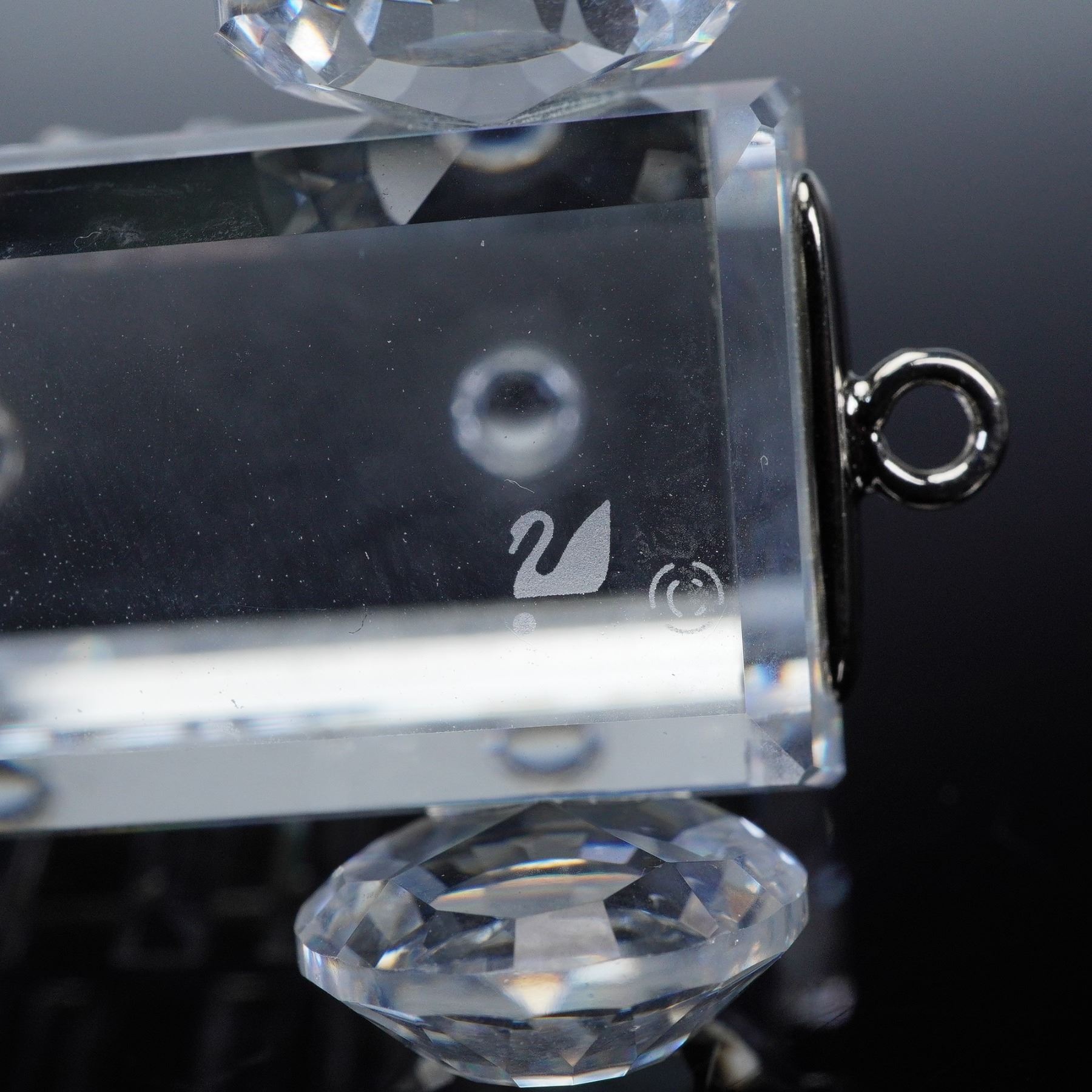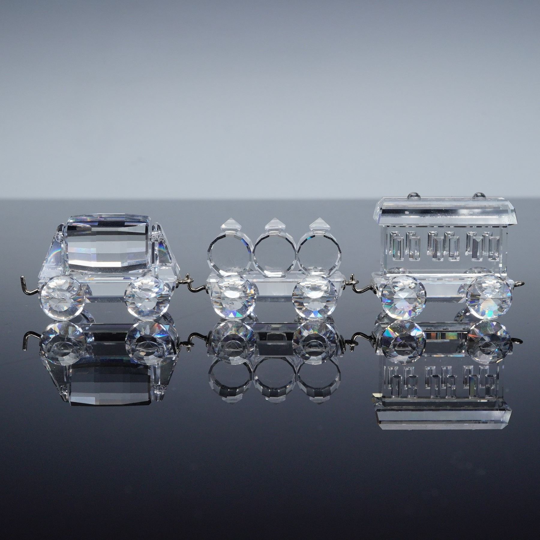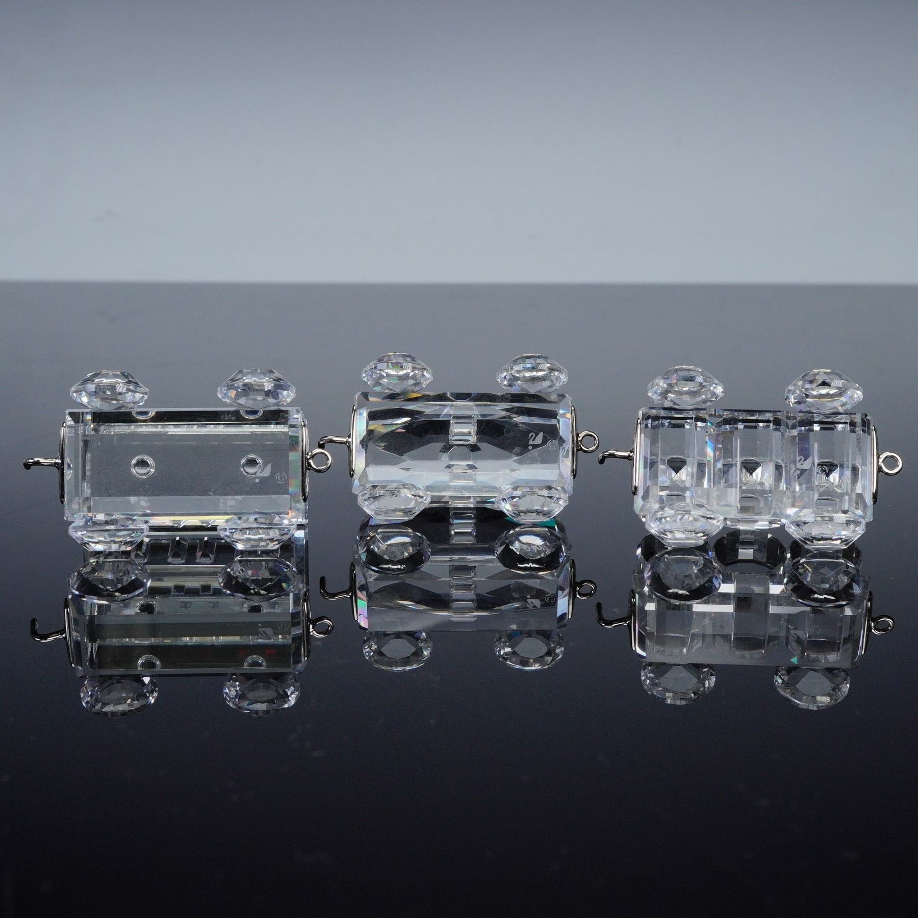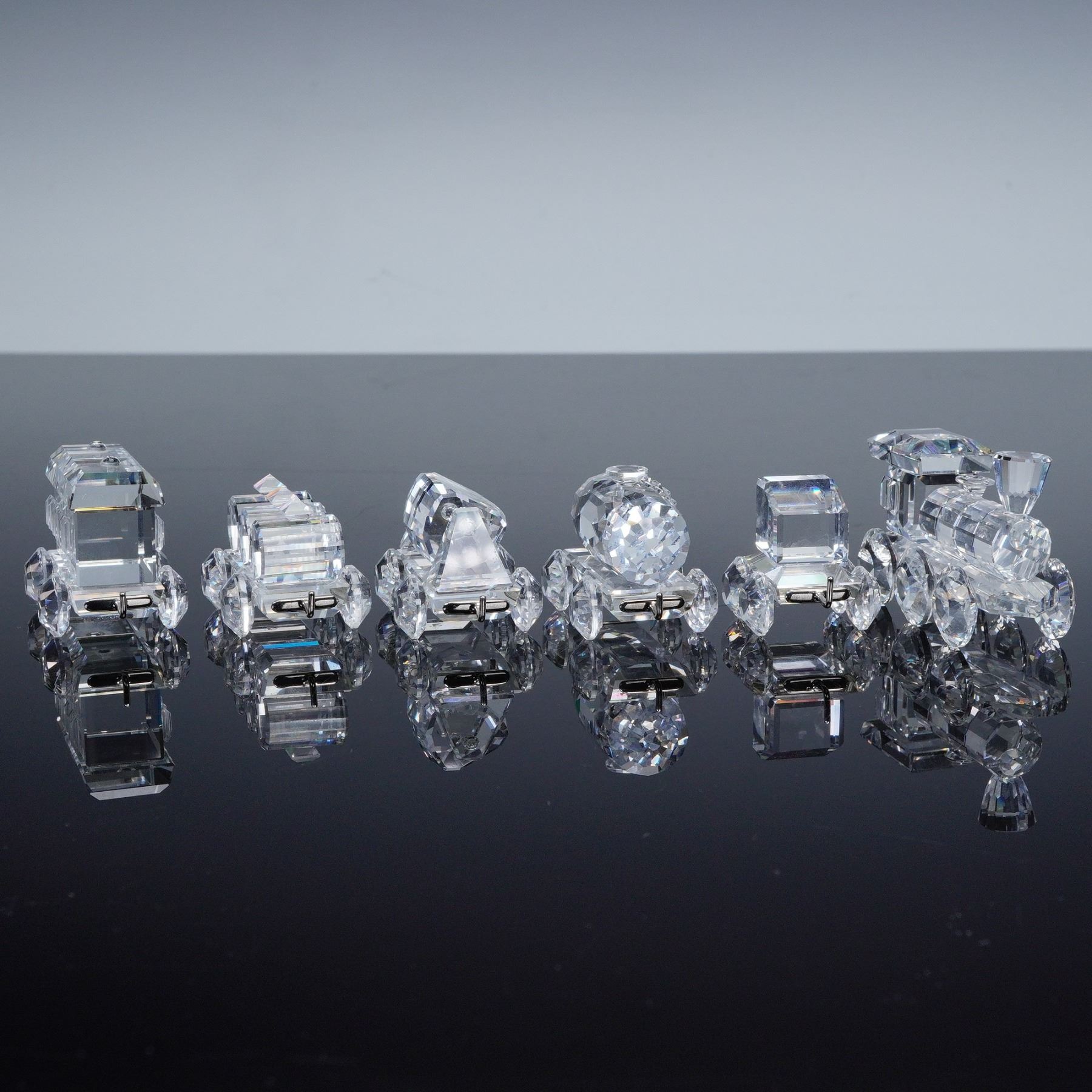 Complete Swarovski Silver Crystal Express train set including the locomotive, tender car, passenger carriage, petrol wagon, tipping wagon, and tank wagon, displayed on a mirrored track base. Each crystal piece is finely detailed with faceted surfaces that capture the light beautifully, and all bear the Swarovski swan logo hallmark. Every train piece is accompanied by its original box, while the mirror track base is included without a box. A sought after collector's set showcasing Swarovski craftsmanship and design.