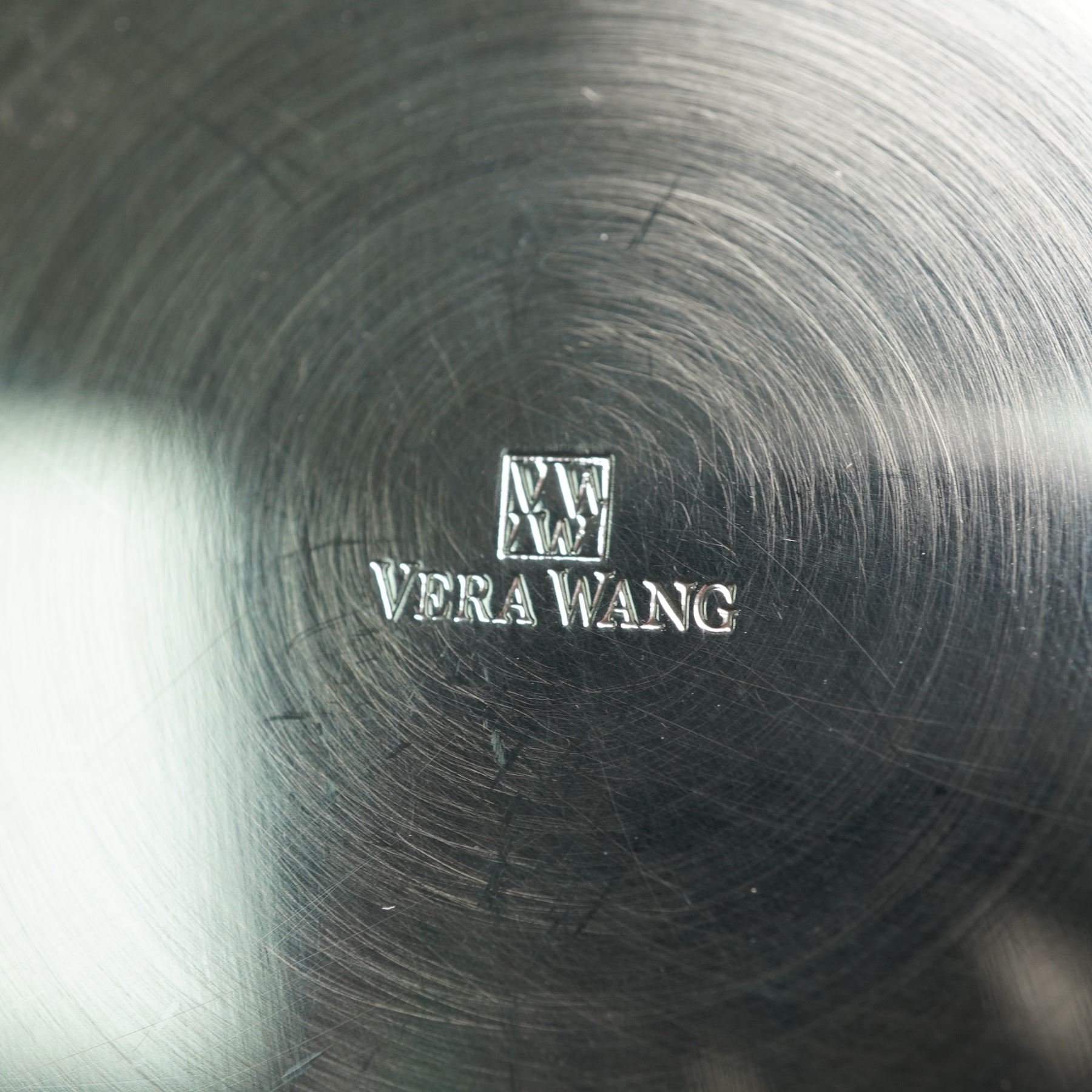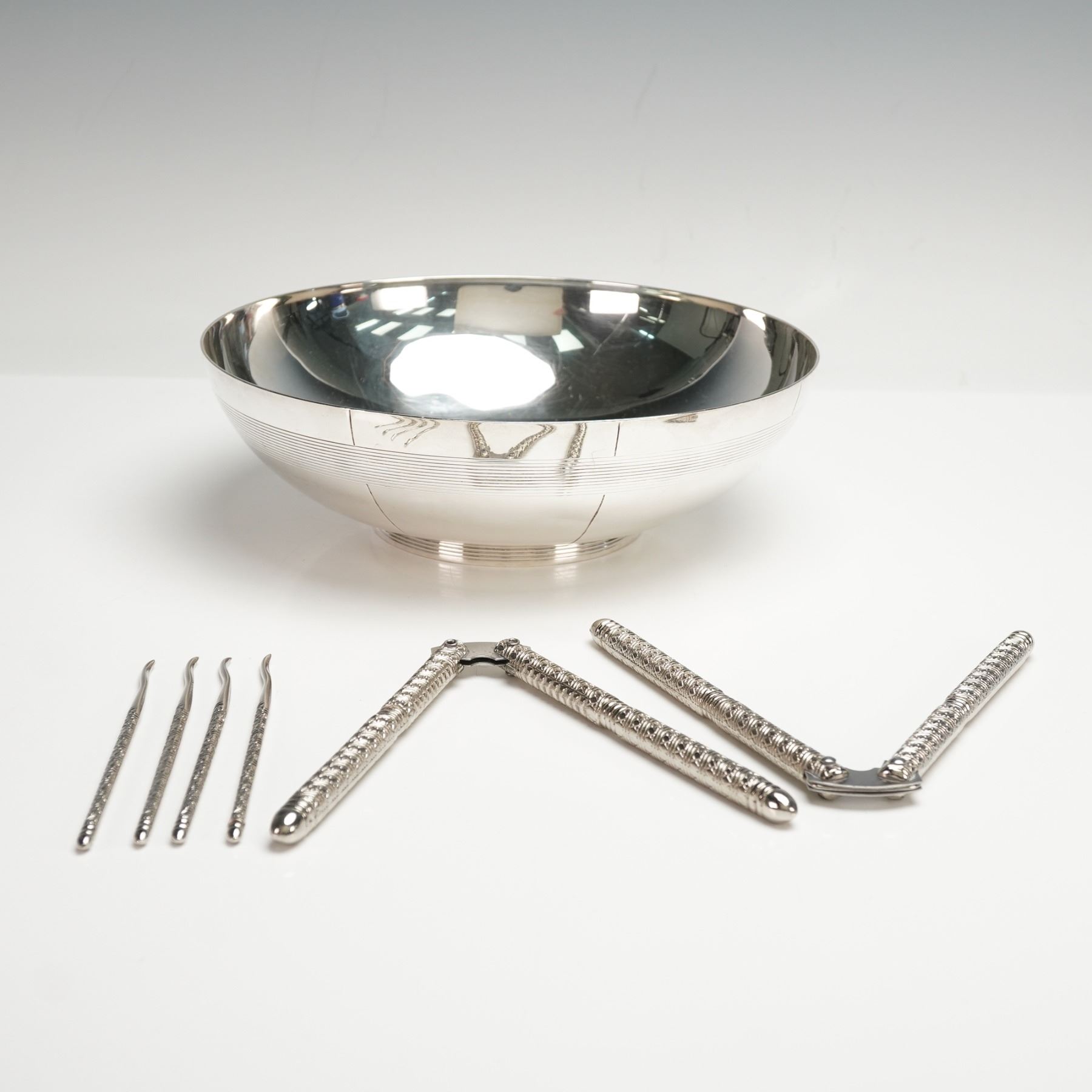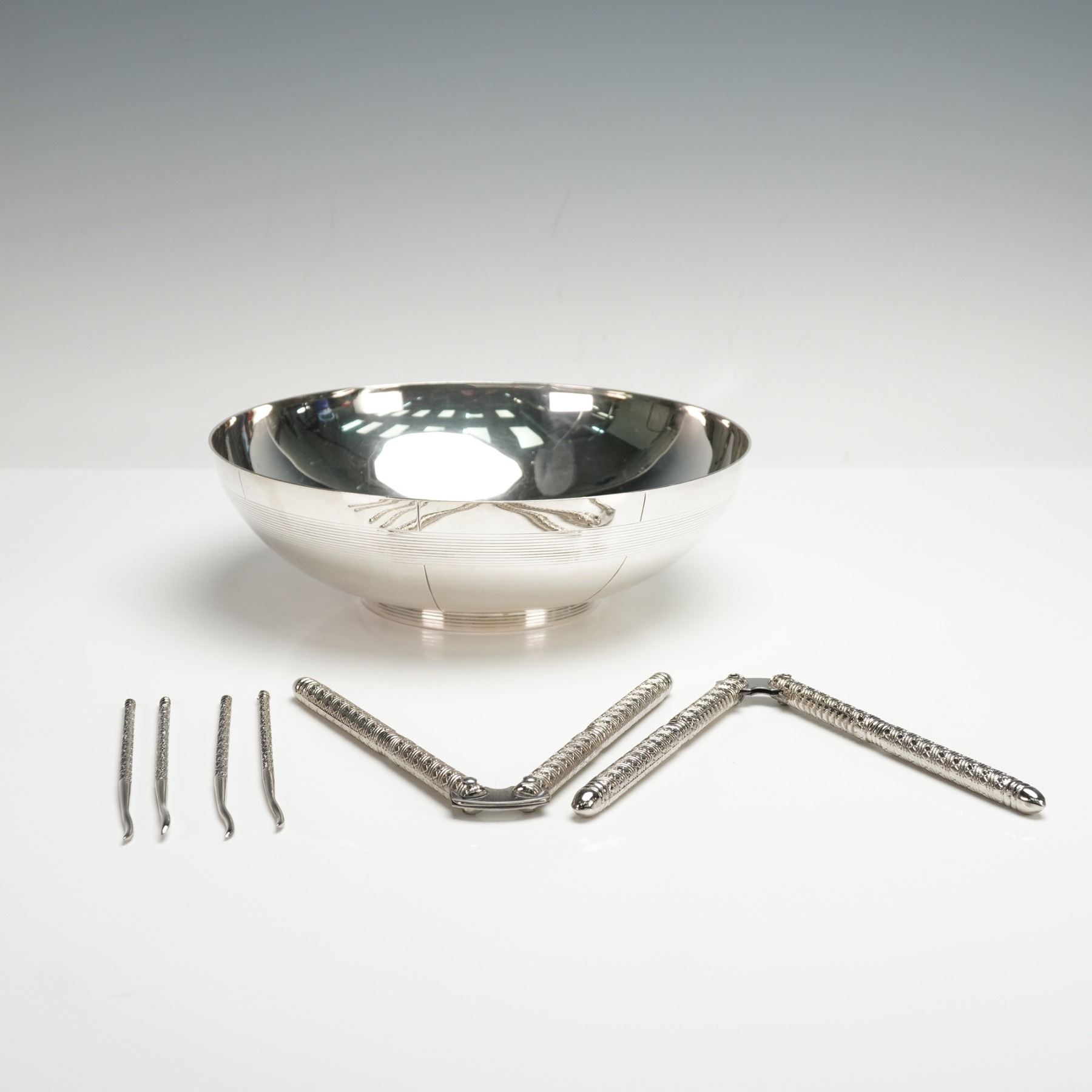 This Vera Wang silver-tone set includes a round serving bowl and six seafood utensils. The bowl has a reflective finish with fine horizontal line detailing and is marked Vera Wang on the underside. The utensils consist of two hinged shell crackers with textured handles and four matching seafood picks with narrow hooked tips. All components share a consistent silver-tone surface.