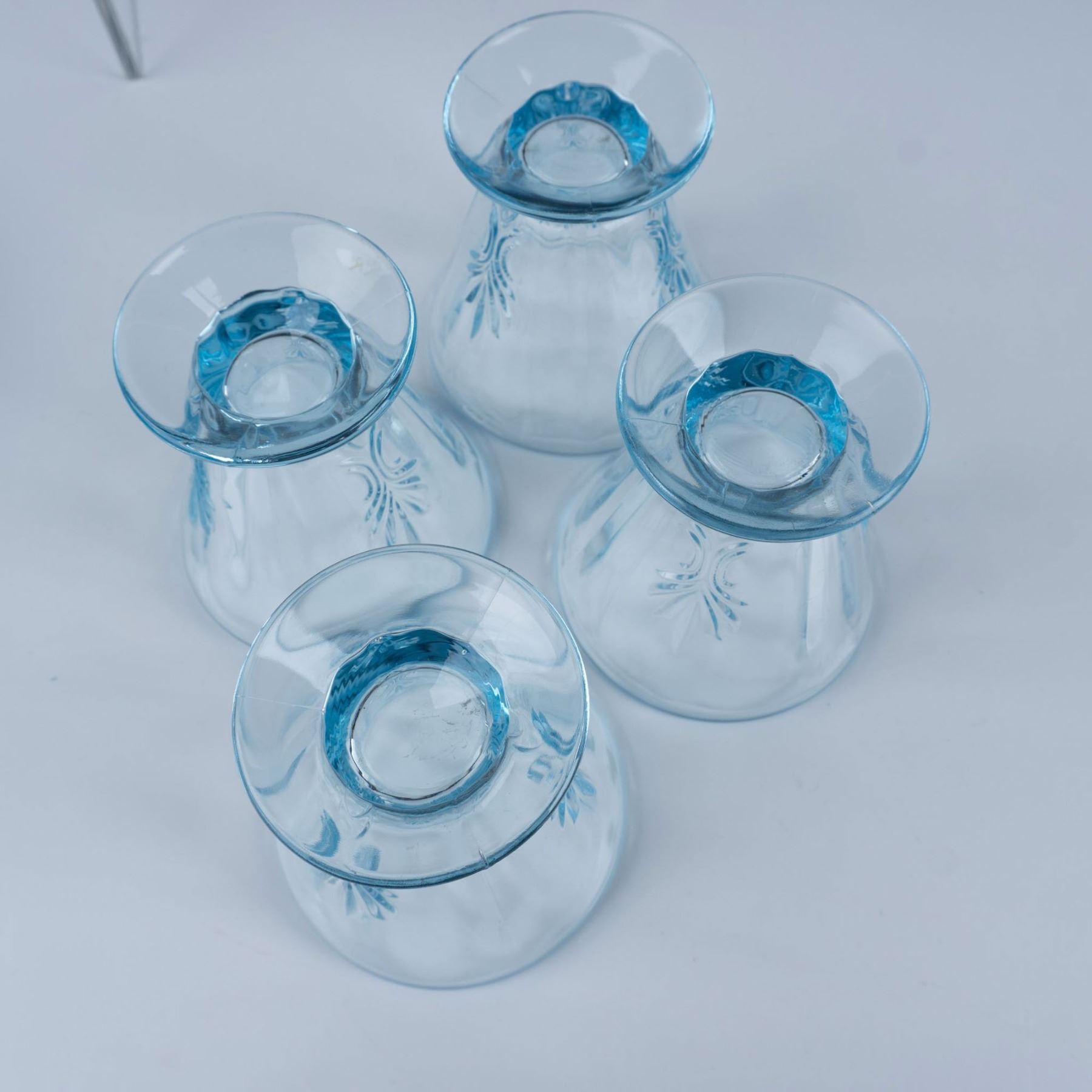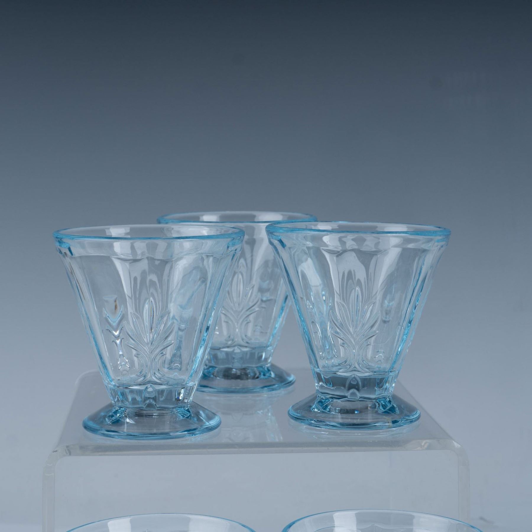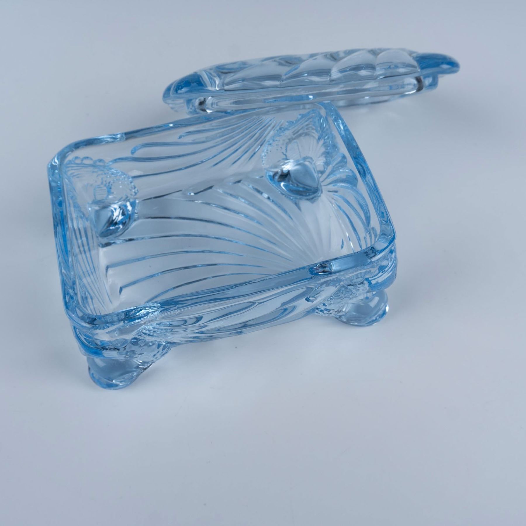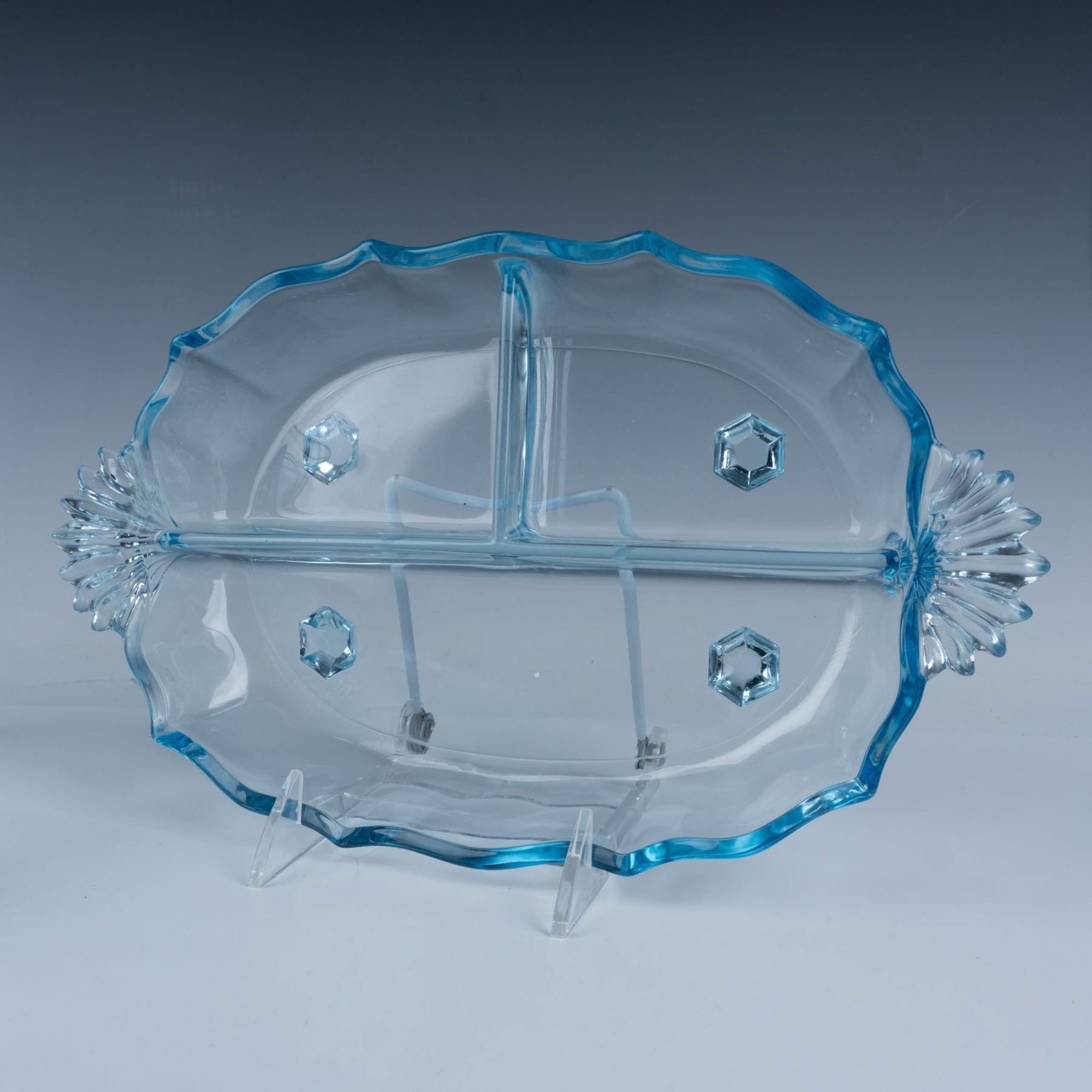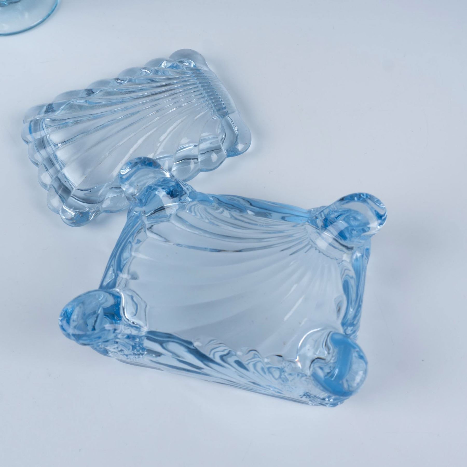 This elegant grouping includes a Fostoria Baroque blue divided serving tray with three compartments and five matching Fostoria Baroque blue juice glasses. Also featured is a Caprice Moonlight blue footed cigarette box with lid. The largest piece measures 12.25"L x 7.25"W x 2"H.