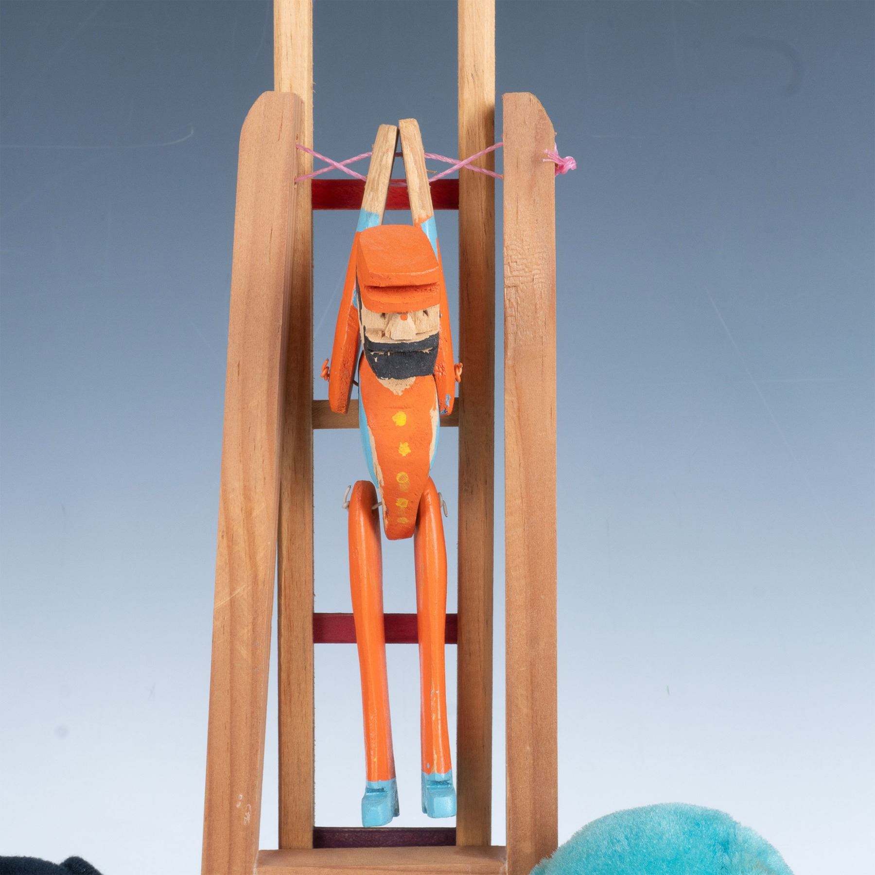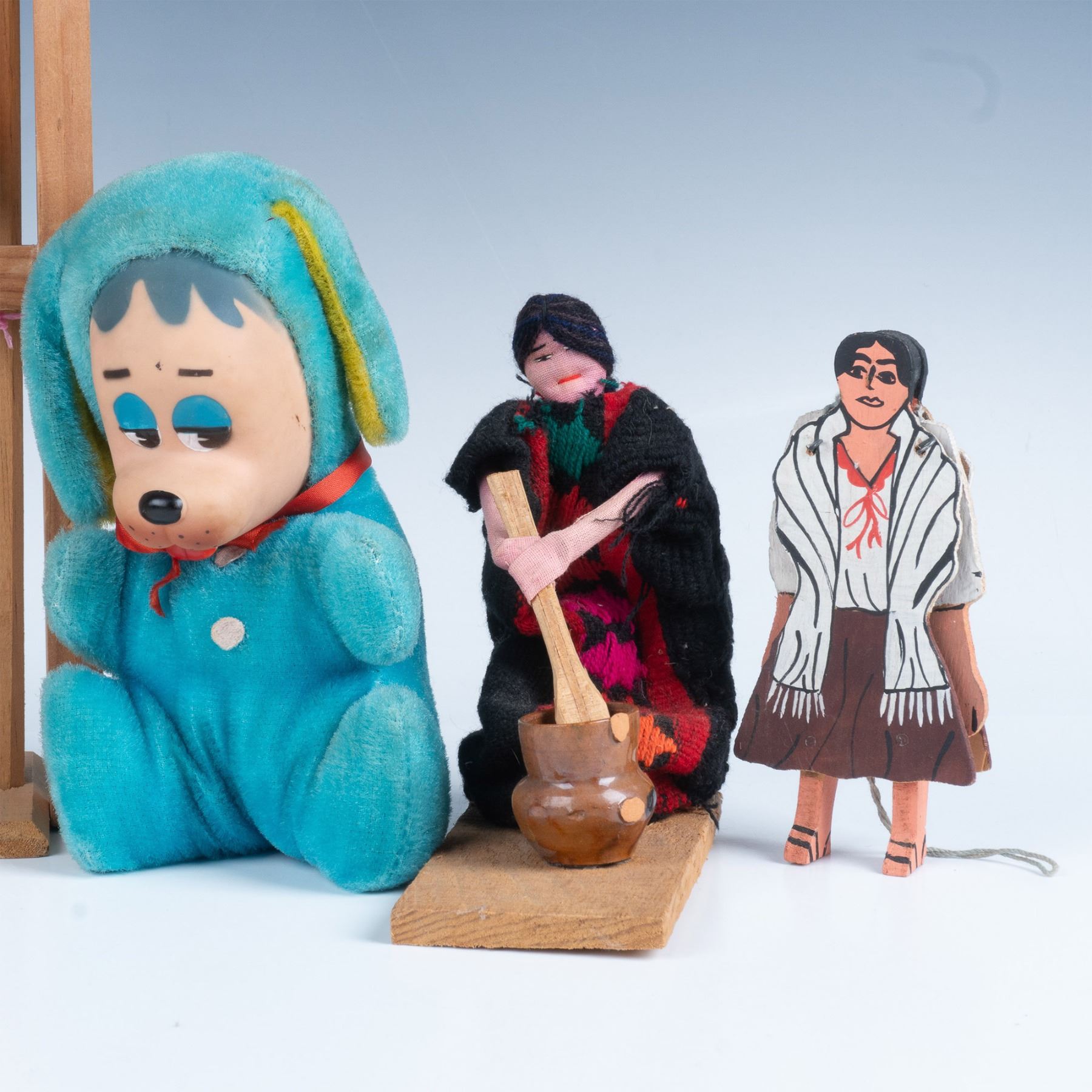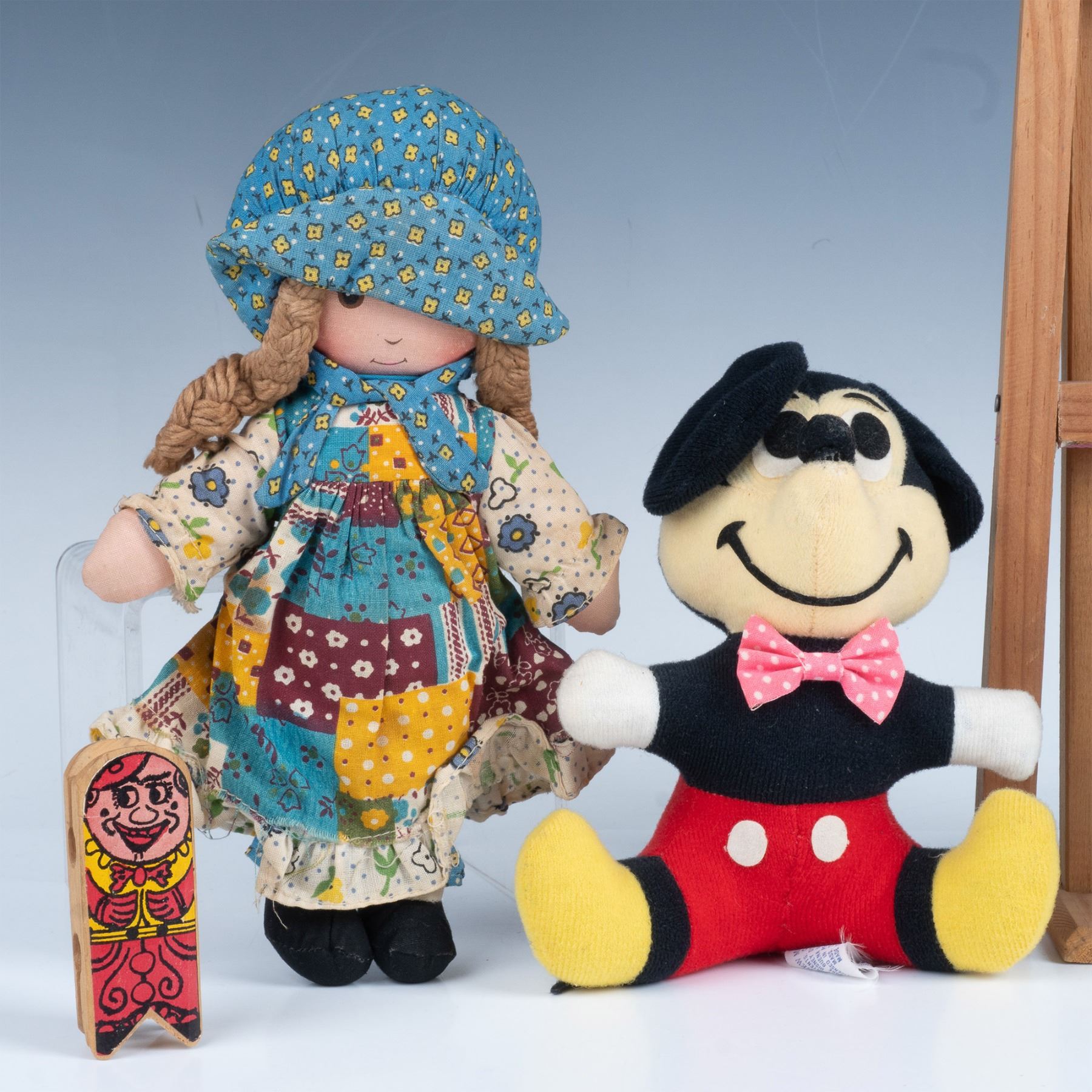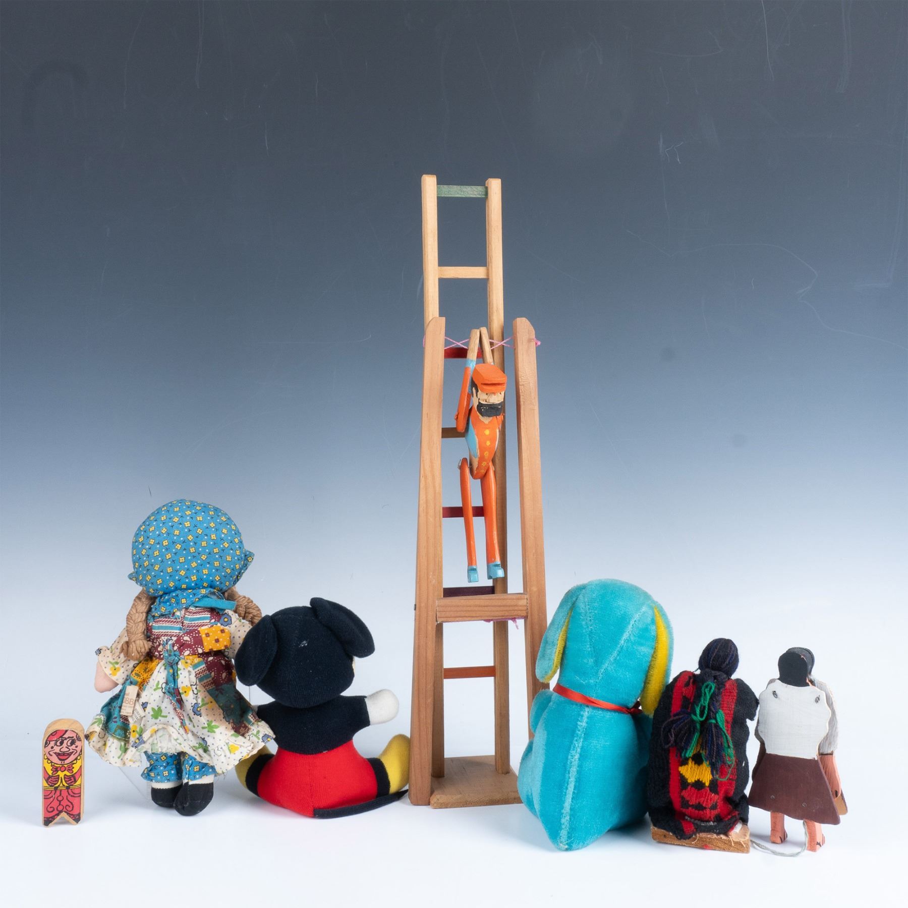 Magnificent set of toys that includes an acrobatic man that swings if you squeeze the wooden handles, a ladder with a figurine that spins around the steps, a woman who throws her hands up, a woman with knit clothing that spins a pot, a plush Mickey Mouse, a plush hound dog, and a Holly Hobbie doll. Largest item measures 3.5"L x 3"W x 18.5"H.
