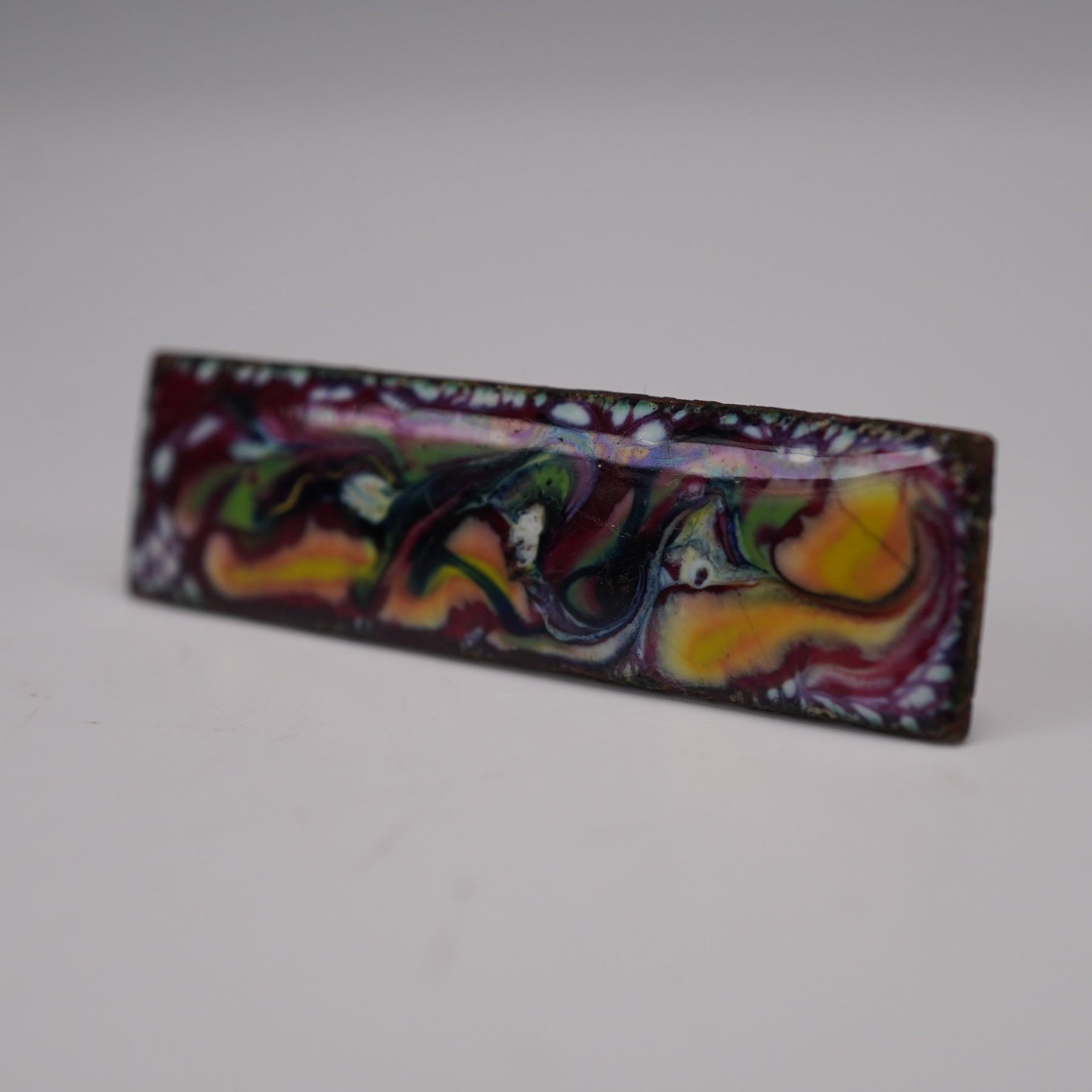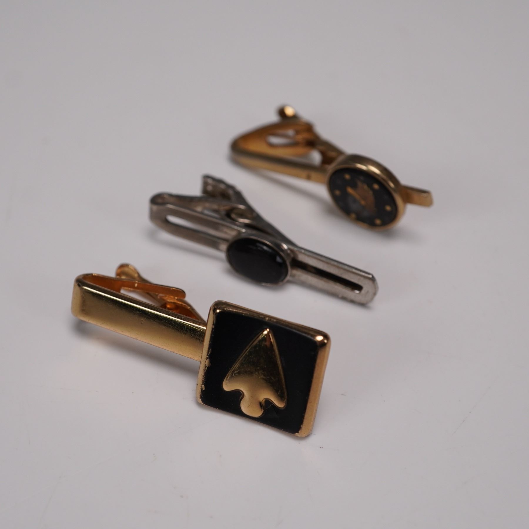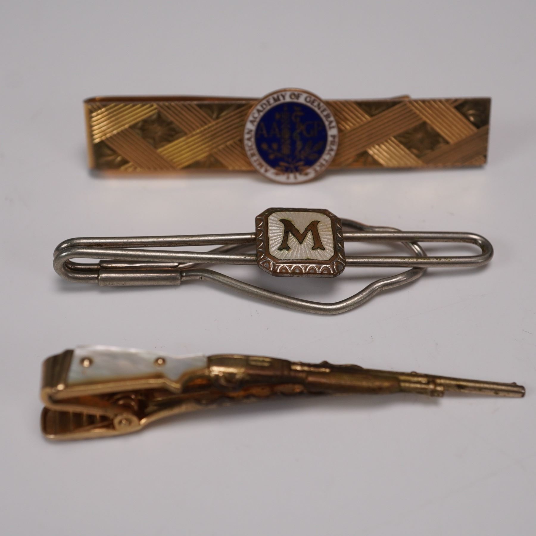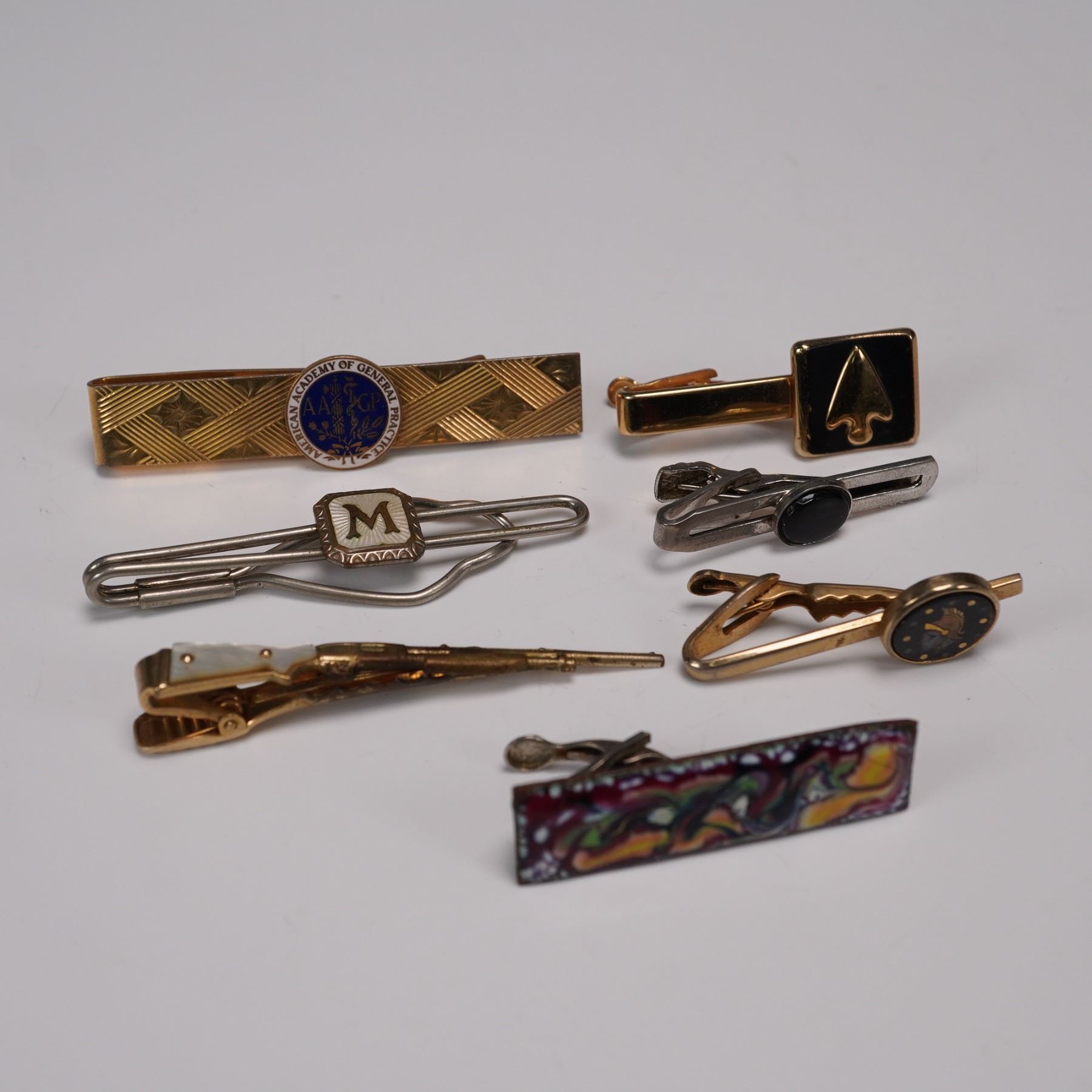 Eclectic assortment of seven mid-century men's tie clips featuring a range of whimsical and formal designs. Includes a gold tone bar with enameled seal from the American Academy of General Practice, a stylized "M" monogram clip over double wire construction, and a rifle-themed tie bar with faux mother-of-pearl detailing. Also included are three clasp-style clips with novelty motifs: a spade emblem, black oval cabochon, and a miniature wristwatch with crown design. Finishing the group is a vivid, abstractly enameled rectangular bar in reds, yellows and purples. Moderate signs of age and wear throughout. Novelty appeal and diversity of styles will attract collectors, despite being largely non-precious materials.