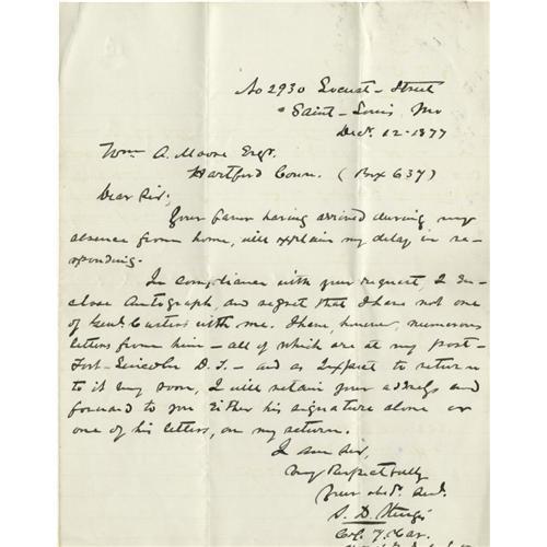 <B>7th Cavalry Autograph Collection</B></I> consisting of six signed documents and letters. The 7th Cavalry Regiment was organized on September 21, 1866 at Fort Riley, Kansas as part of an expansion of the Regular Army following the Civil War. From 1866 through 1871, the Regiment was posted at Ft. Riley and fought in the Indian Wars. From 1871 through 1873, it participated in occupation duties during the Reconstruction period in the south before being sent north once more to the Dakota Territory. Lt. Col. George A. Custer's disaster at the Battle of the Little Bighorn on June 25-26, 1876, while a stunning defeat, demonstrated the sheer bravery of the 7th Cavalrymen: fourteen soldiers received the Congressional Medal of Honor during that battle. The Regiment was present at the Wounded Knee Massacre on December 29, 1890, the end of the Indian Wars. <BR><BR>This lot includes the following items related to this legendary unit: Henry J. Nowlan (1875 DS); Winfield Scott Edgerly (1876 DS also signed by William Passmore Carlin); Edwin Eckerson (1878 DS); William H. Baldwin (1879 ALS); Elmer Otis (1877 DS); Samuel D. Sturgis (1877 ALS). Generally fine condition. From the Henry E. Luhrs Collection. Accompanied by LOA from PSA/DNA.