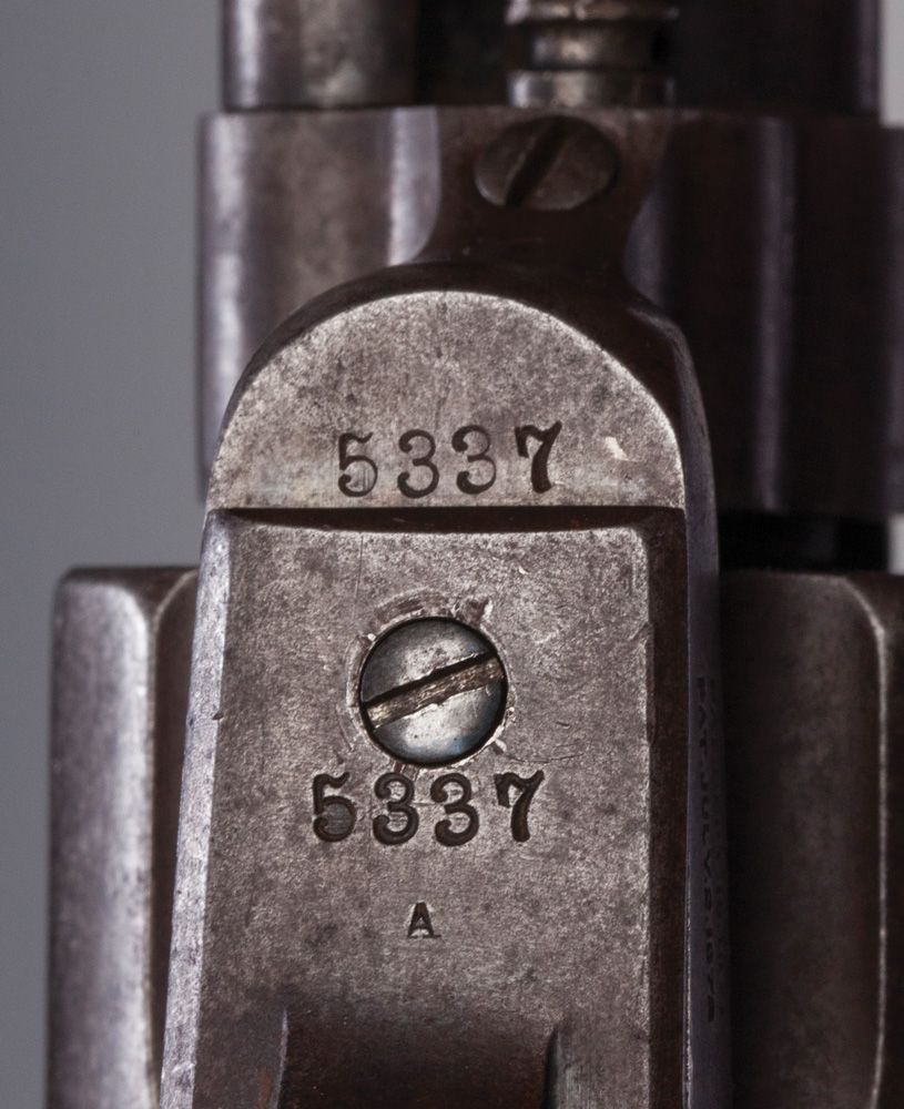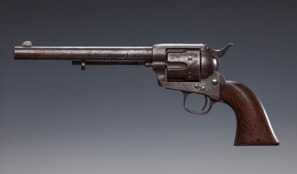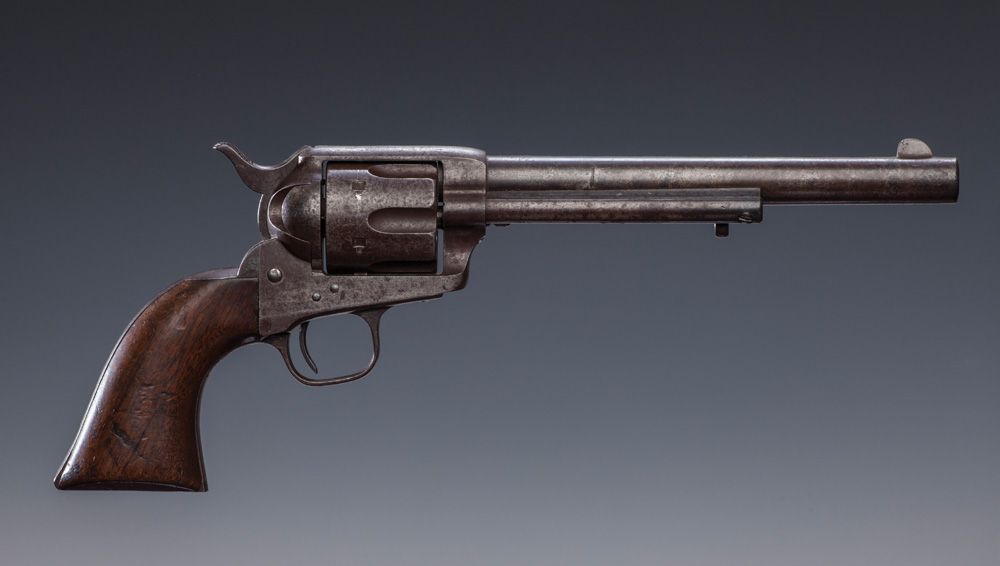 7th Cavalry Colt Single Action Revolver. S/N 5337, circa 1874, U. S. Cavalry purchase, .45 LC, 7 1/2" barrel, early style script barrel address, early style ejector housing and ejector head, one-piece walnut grips, O. W. Ainsworth inspected. According to Kopek and Sterling’s study of U.S. military single actions, this revolver is in the range of revolvers issued to Co. M, under Reno’s command. This serial number falls well within the range of revolvers issued to Custer’s Seventh Cavalry. CONDITION: Revolver is smooth “gun metal gray” with touches of original blue on barrel, protected areas, and in cylinder flutes; frame and hammer show silvering case colors, pair of small dents on left of barrel, one on the right; all inspector’s marks are clear and correct, barrel address, patent dates and US mark clear and sharp, crisp serial numbers, serial on cylinder is 4870, same year manufacture, and condition matches the rest of the revolver; grips are very good with small amount of metal showing on toe and heel of butt and faint cartouche.