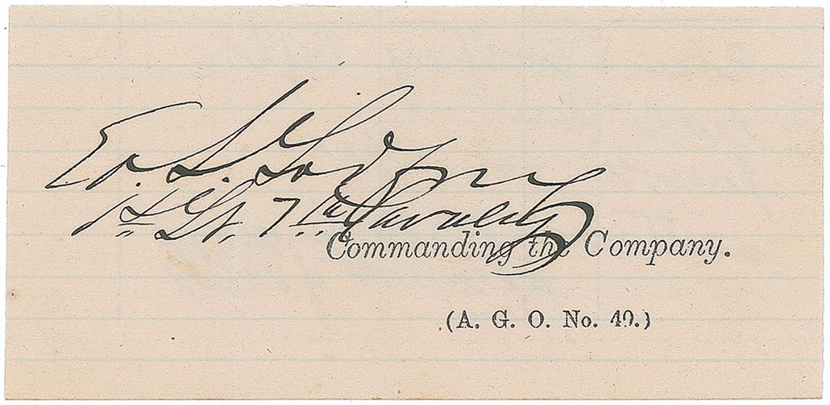 US Army officer (1843–1932) who survived the Battle of the Little Bighorn as a member of Custer’s 7th Cavalry Regiment. Ink signature, “Ed. S. Godfrey, 1st Lt. 7th Cavalry,” on an off-white 3.75 x 2 slip clipped from a larger document. In fine condition.