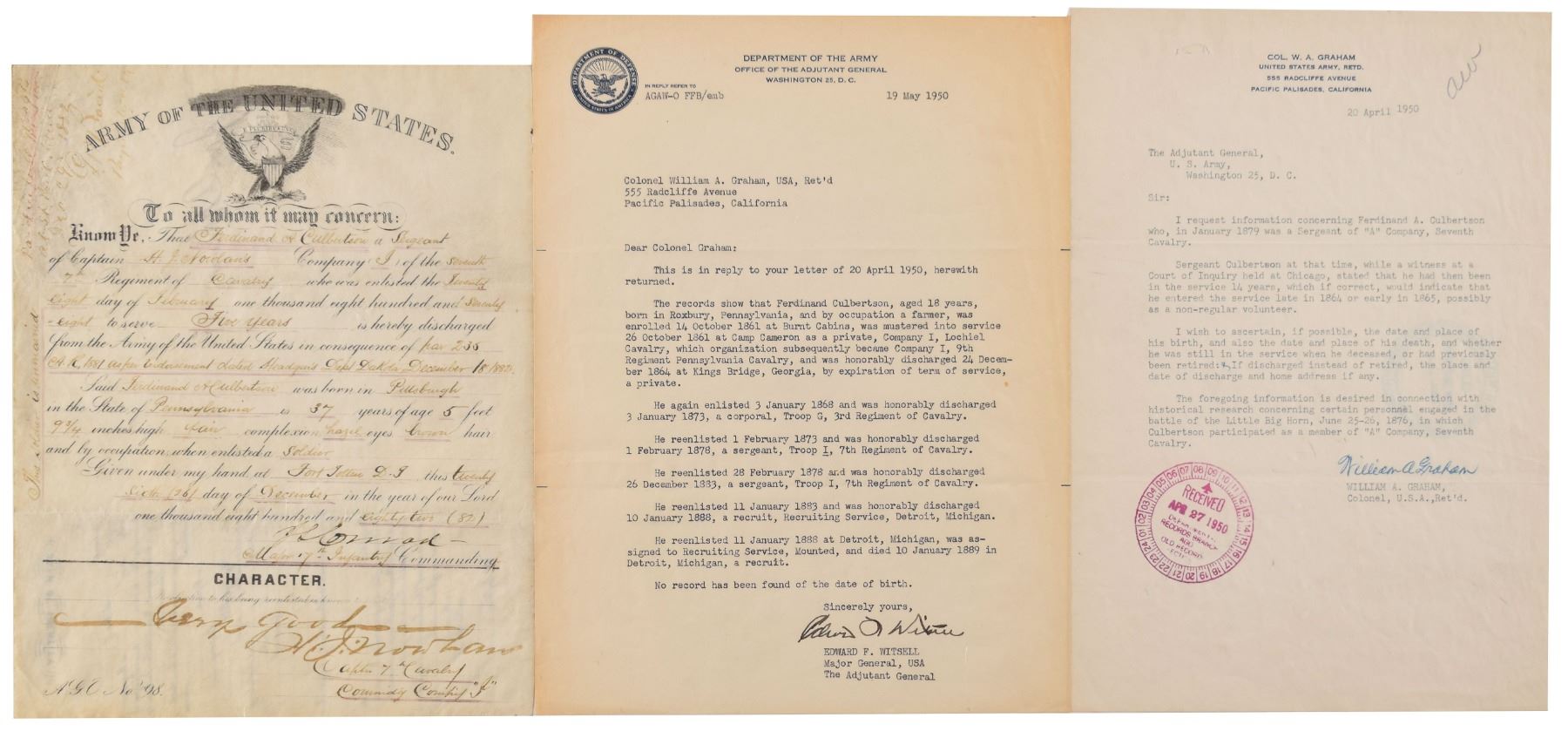 Partly-printed document, one page, 7.5 x 9.5, December 26, 1882. Document discharging Ferdinand Culbertson from the 7th Cavalry, in part: "Know Ye, That Ferdinand A. Culbertson, a Sergeant of Captain H. J. Nowlan's Company ('J') of the Seventh Regiment of Cavalry…is hereby discharged from the Army of the United States." Signed at the conclusion by Major J. S. Conrad, and countersigned by Captain H. J. Nowlan, who certifies Sgt. Culbertson's character as "Very good." In fine condition. Accompanied by two 1950 letters concerning inquiries about Culbertson's service and military record. Culbertson, who was serving in the 7th Cavalry's Company A during the Battle of the Little Bighorn and did not participate in the battle, is remembered for recovering the famed 'Culbertson Guidon' while part of a burial detail tasked with interring the dead American soldiers three days after the fight. Culberston discovered the folded American cavalry flag on the body of Corporal John Foley, which remains the only known flag recovered from the battlefield.