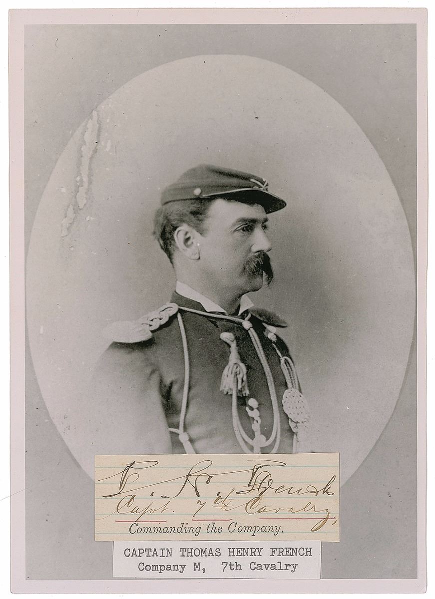 US Army officer (1843-1882) who survived the Battle of the Little Bighorn as a member of Custer’s 7th Cavalry Regiment. Ink signature, “T. H. French, Capt. 7th Cavalry,” on an off-white 3 x 1 slip clipped from a larger document and affixed to a modern glossy 5 x 7 photo. In fine condition.
