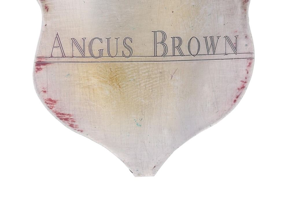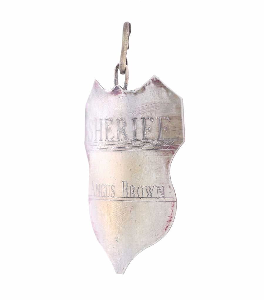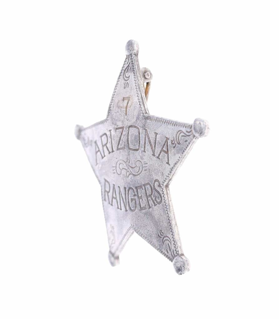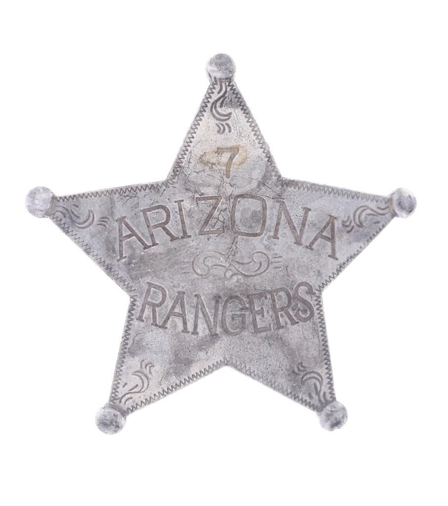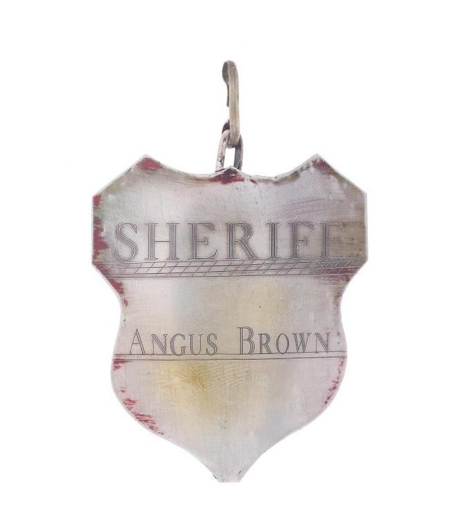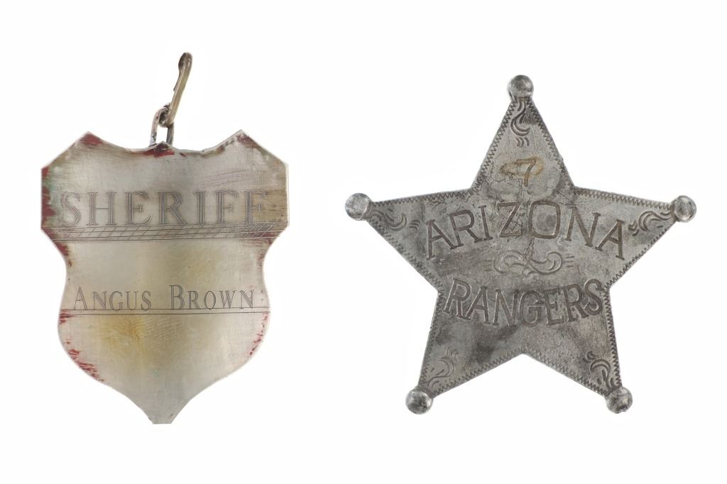Featured in this lot is 7th Rangers Arizona and Angus Brown sheriff badges circa 19th century. The badges feature a wonderfully and professionally crafted stainless steel construction that shows a five point design and shield design the firs reads as follows: 7 Arizona - Rangers. The second reads as follows: Sheriff - Angus Brown. The condition of this pair of law enforcement badges is well preserved with no obvious signs of damage and shows some patina and paint to the one badge but otherwise shows well preserved condition. The measurements of these badges 2 3/4" x 3" x 1/4" and 2 5/8" x 2 1/4" x 1/4". The collective weight of these badges is U6oz.