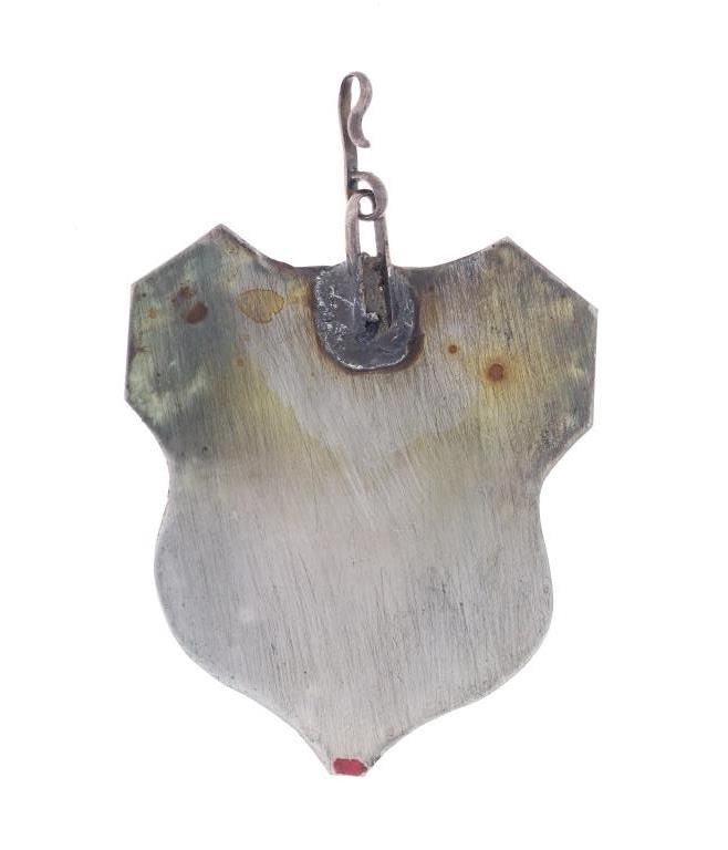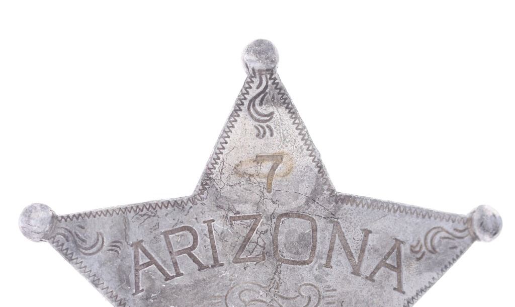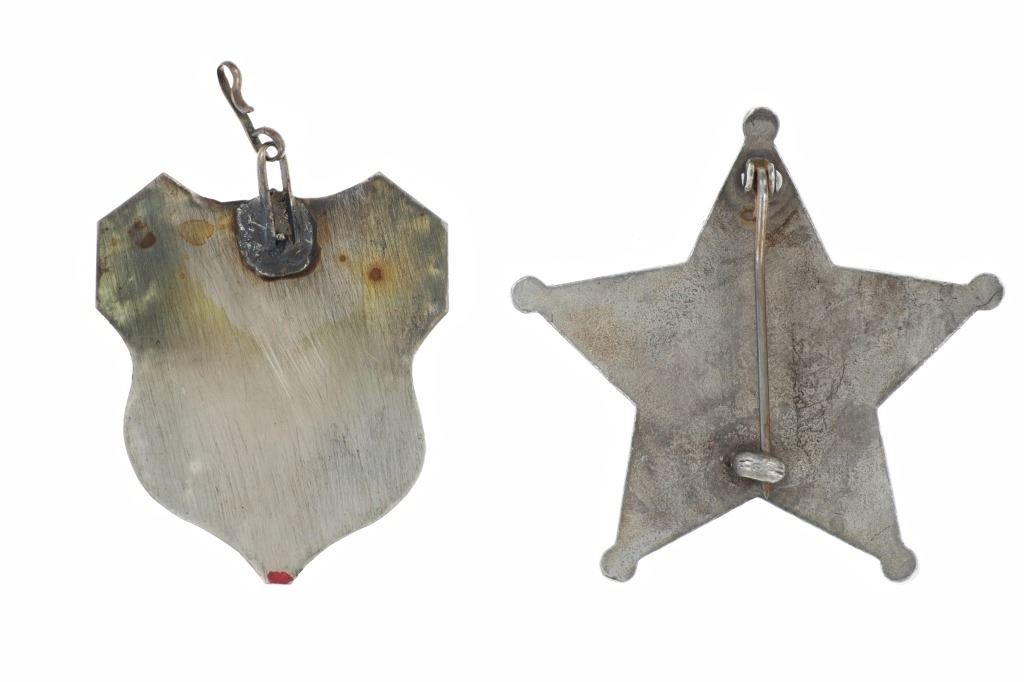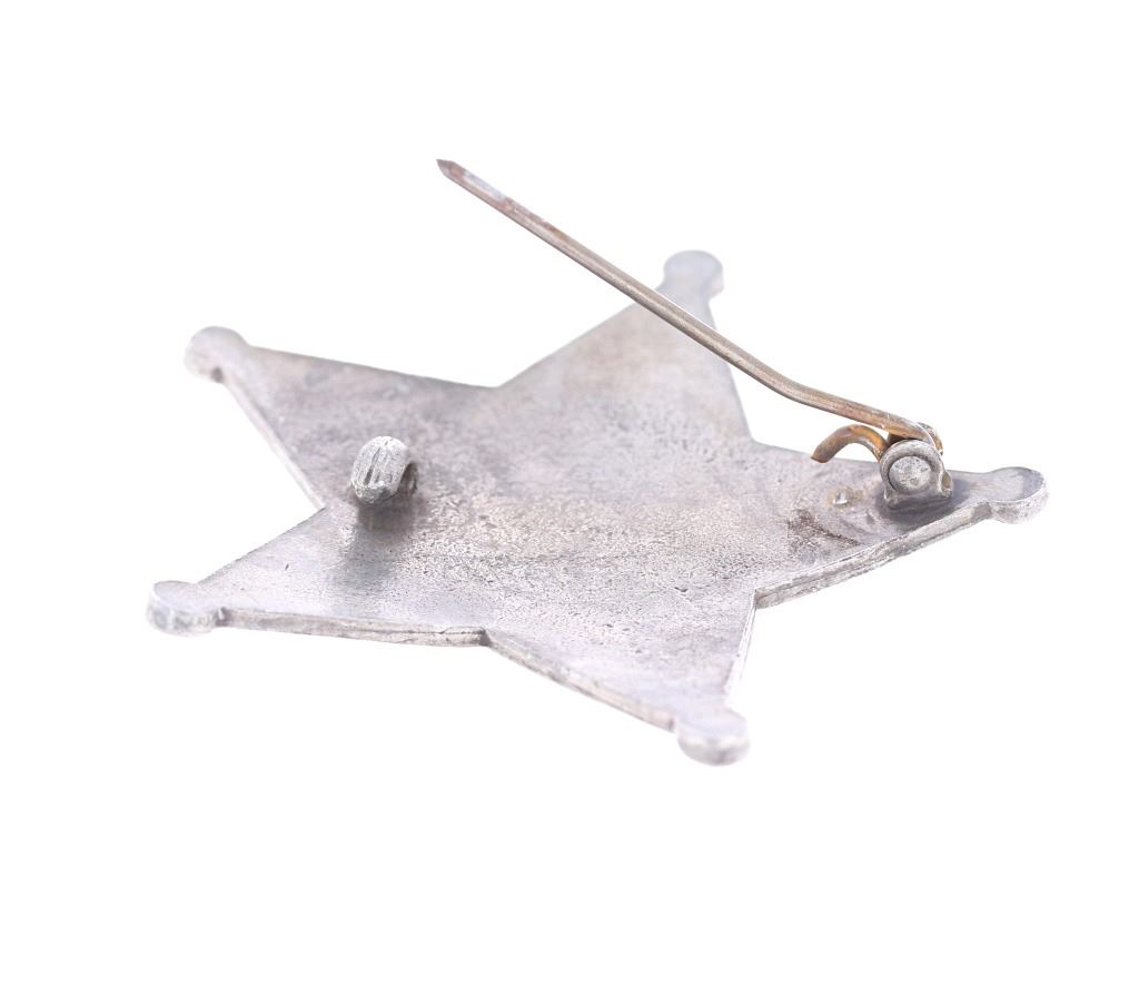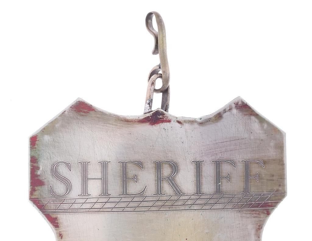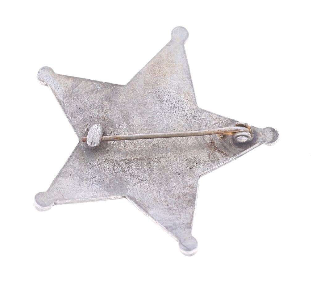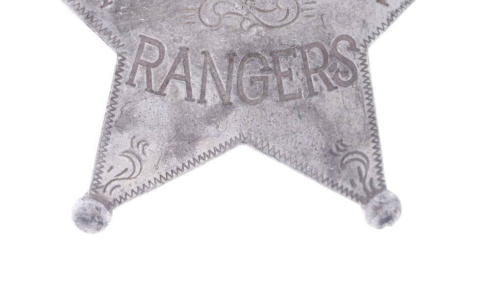 Featured in this lot is 7th Rangers Arizona and Angus Brown sheriff badges circa 19th century. The badges feature a wonderfully and professionally crafted stainless steel construction that shows a five point design and shield design the firs reads as follows: 7 Arizona - Rangers. The second reads as follows: Sheriff - Angus Brown. The condition of this pair of law enforcement badges is well preserved with no obvious signs of damage and shows some patina and paint to the one badge but otherwise shows well preserved condition. The measurements of these badges 2 3/4" x 3" x 1/4" and 2 5/8" x 2 1/4" x 1/4". The collective weight of these badges is U6oz.
