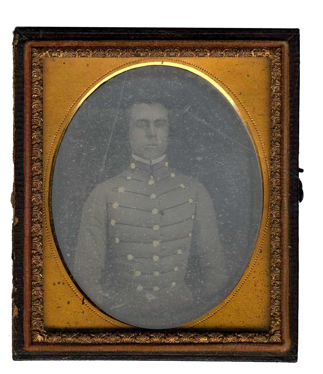 Sixth-plage daguerreotype of Captain John Fletcher who served in the 7th Virginia Cavalry under Captain Turner Ashby. Fletcher was born in 1835, graduated from VMI and, while serving in the 7th Virginia, was killed leading a cavalry charge at Buckton Station, VA on 23 May 1862. A day earlier, on 22 May 1862, the 7th VA Cavalry was doing its part in General Stonewall Jackson's plan of capturing the Union garrison at Front Royal. Ashby's men moved out at daybreak and at midmorning, they were at Buckton Station, a key stop on the Manassas Gap Railroad, halfway between the towns of Strasburg and Front Royal. The Confederates sneaked into Buckton Station and, in less than 5 minutes, took possession of the station but not before losing 3 men in the charge, including Captain Fletcher. Daguerreotype of Fletcher in his VMI uniform is somewhat light and oxidized around edges, though very good condition otherwise. Full case present, though detached. From the collection of John K. Gott of Fauquier County, Virginia, noted author, historian and collector of Civil War and Virginia memorabilia.