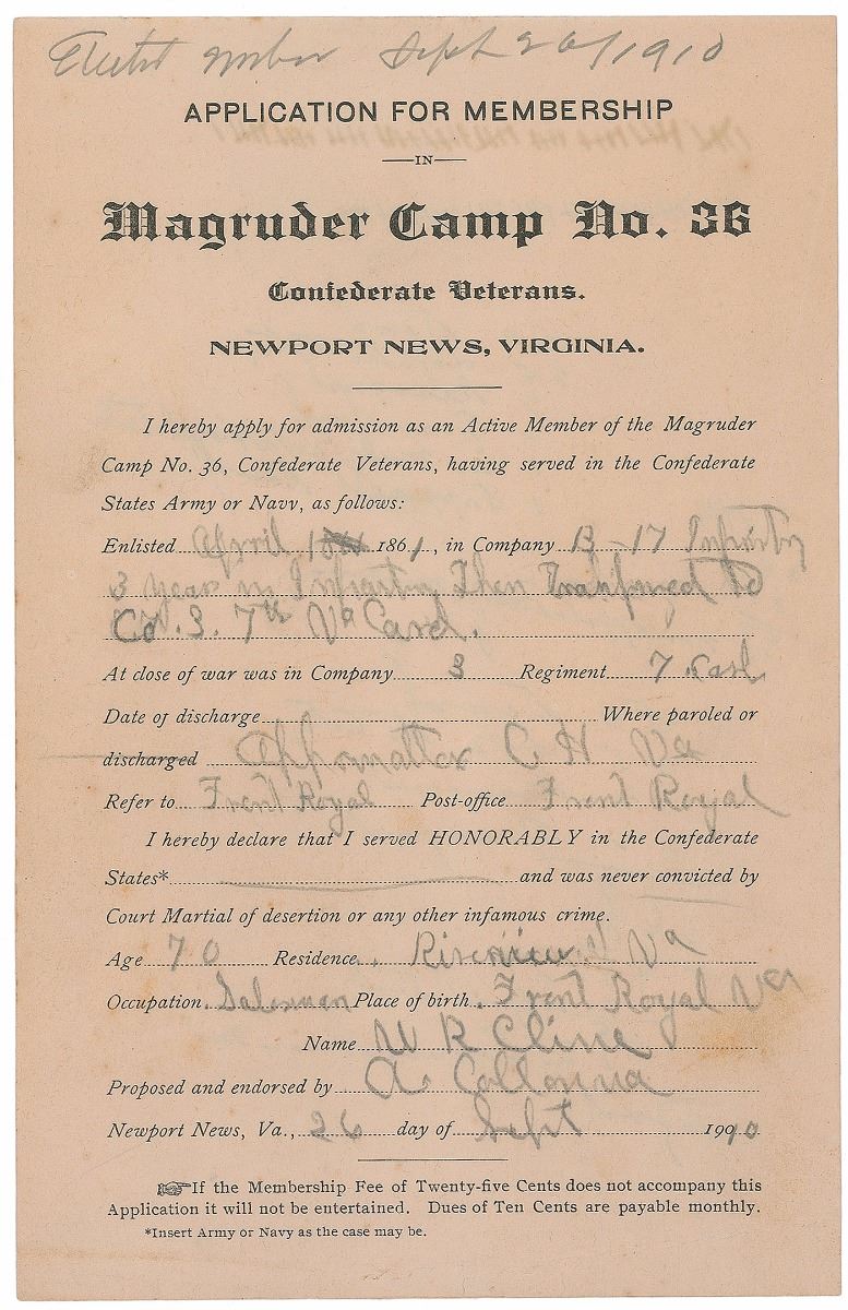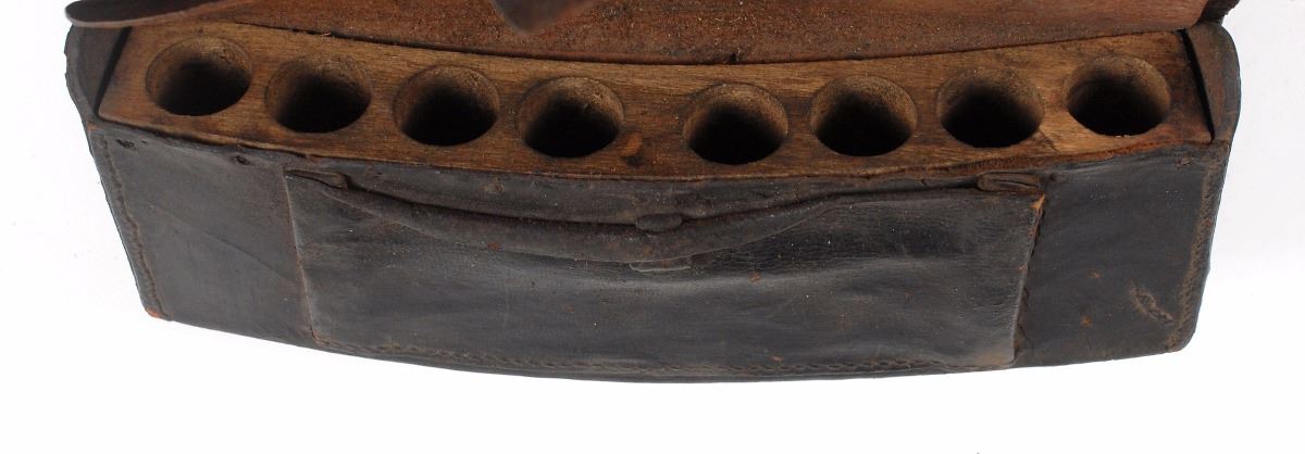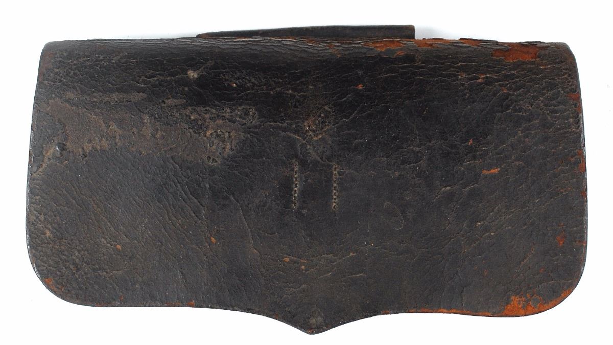 Confederate cartridge box of pre-war manufacture used by W. R. Cline of the 7th Virginia Cavalry. The cartridge box measures approximately 8.75 x 4.5 x 1.75 and is constructed using a heavy dark brown leather with a wide single belt loop on the reverse. The large outer flap has a latch tab which closes over a small flat brass finial on the bottom of the box, and opens to reveal another flap over the main compartment and a thin tool pouch on the front. In the main compartment is a form-fitted wooden block designed to hold eight cartridges of up to .69 caliber. Includes a .577 caliber paper cartridge, embossed on the side "Eley Bros. London," with its original boxwood base plug. Some cracking and flaking to leather, and a small tear to the closure tab, otherwise fine condition. Accompanied by Cline’s 1910 application to join the Confederate Veterans Magruder Post No. 36 in Newport News, Virginia, as well as his yellow worsted wool cavalry hat cord. From the collection of Donald R. Tharpe.