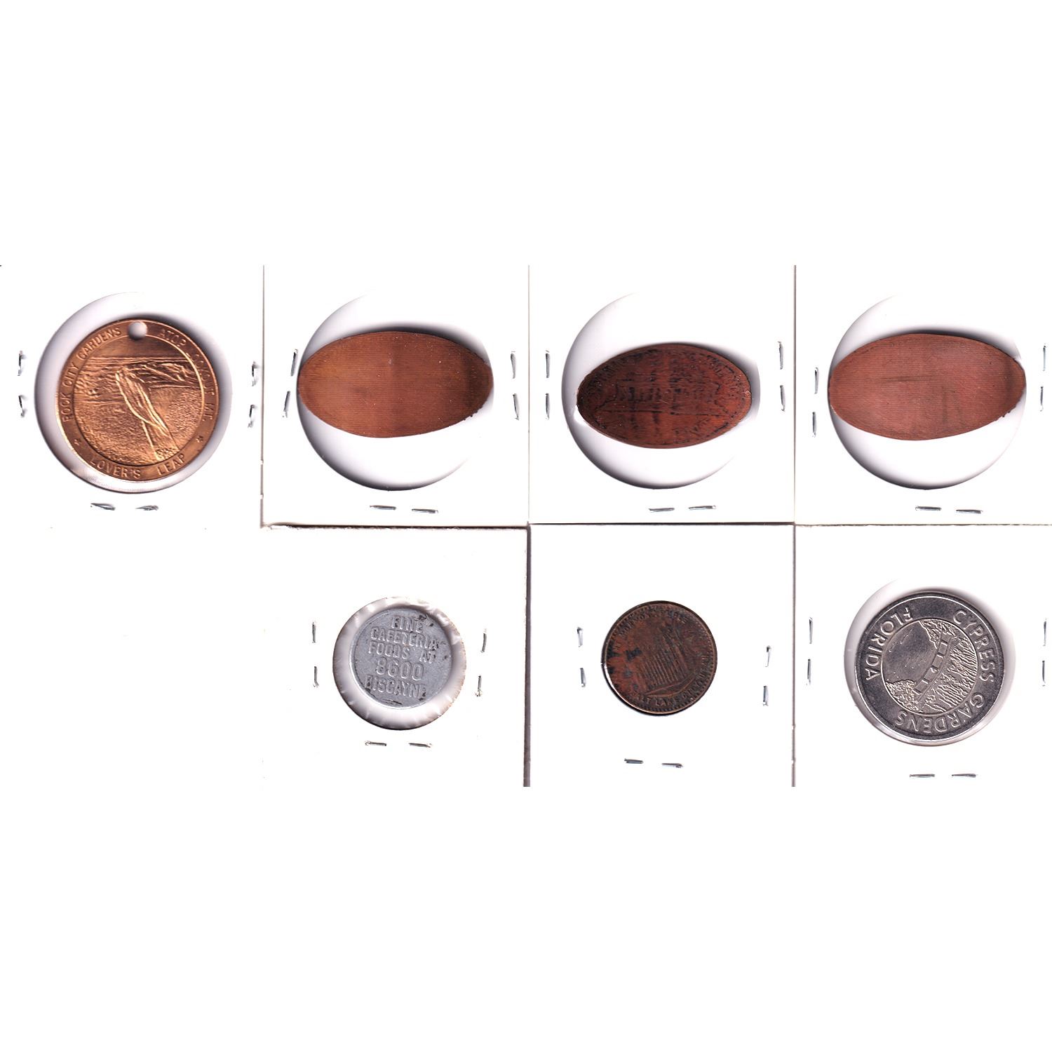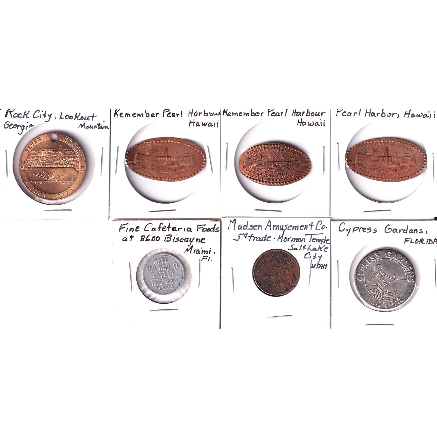 7x USA Assorted Souvenir & Merchant Tokens. Lot Includes: Miami FL "Fine Cafeteria Foods at 8600 Biscayne", Salt Lake City UT Madsen Amusement Co 5-cent Mormon Temple, Florida Cypress Gardens, Georgia Rock City Lookout, & 3x Hawaii Pearl Harbour Commemorative Crushed Pennies. 7pcs.