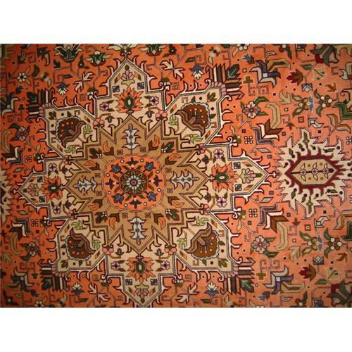 very fine persian art rug. measures about 7x5 ft. give 2 inches for each side. also it has 16 knots per inch. this rug is made in Tabriz and persian writings. it is about 20 years old and in great condition. recently it has been professionally cleaned. it also has leather backing sewed to the back to prevent unnecessary movement. use it on a hard floor or on the carpet. it is great. it is made of a fine wool and very small portion of silk which shines when you look at it. the color is steady and magnificent.