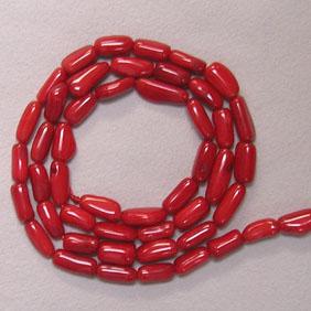 COLOR ENHANCED RED BAMBOO CORAL STRAND. EACH BEAD MEASURES 7x6 MM. LENGTH: 16 INCHES