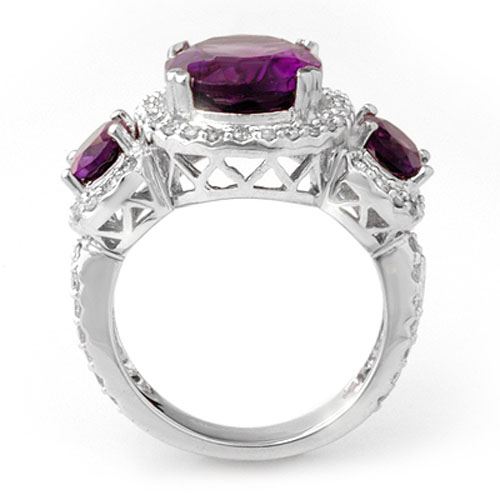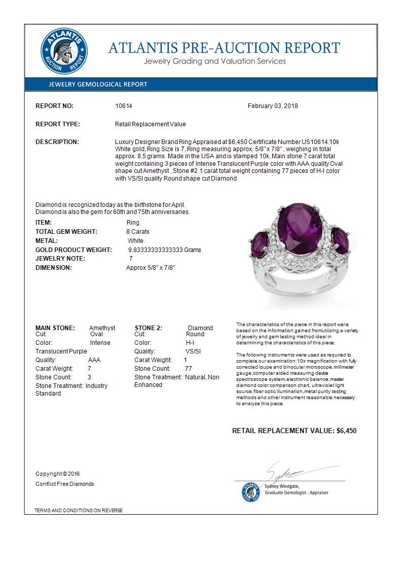 REF-90H5A -10614 ---- 8.0 CTW Amethyst & Diamond Ring 10K White Gold ---- Luxury Designer Brand Ring Appraised at $6,450 Certificate Number US10614 10k White gold, Ring Size is 7, Ring measuring approx. 5/8" x 7/8" , weighing in total approx. 8.5 grams. Made in the USA and is stamped 10k, Main stone 7 carat total weight containing 3 pieces of Intense Translucent Purple color with AAA quality Oval shape cut Amethyst , Stone #2 1 carat total weight containing 77 pieces of H-I color with VS/SI quality Round shape cut Diamond