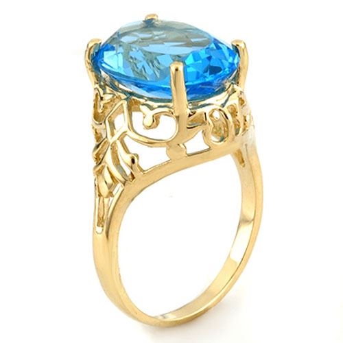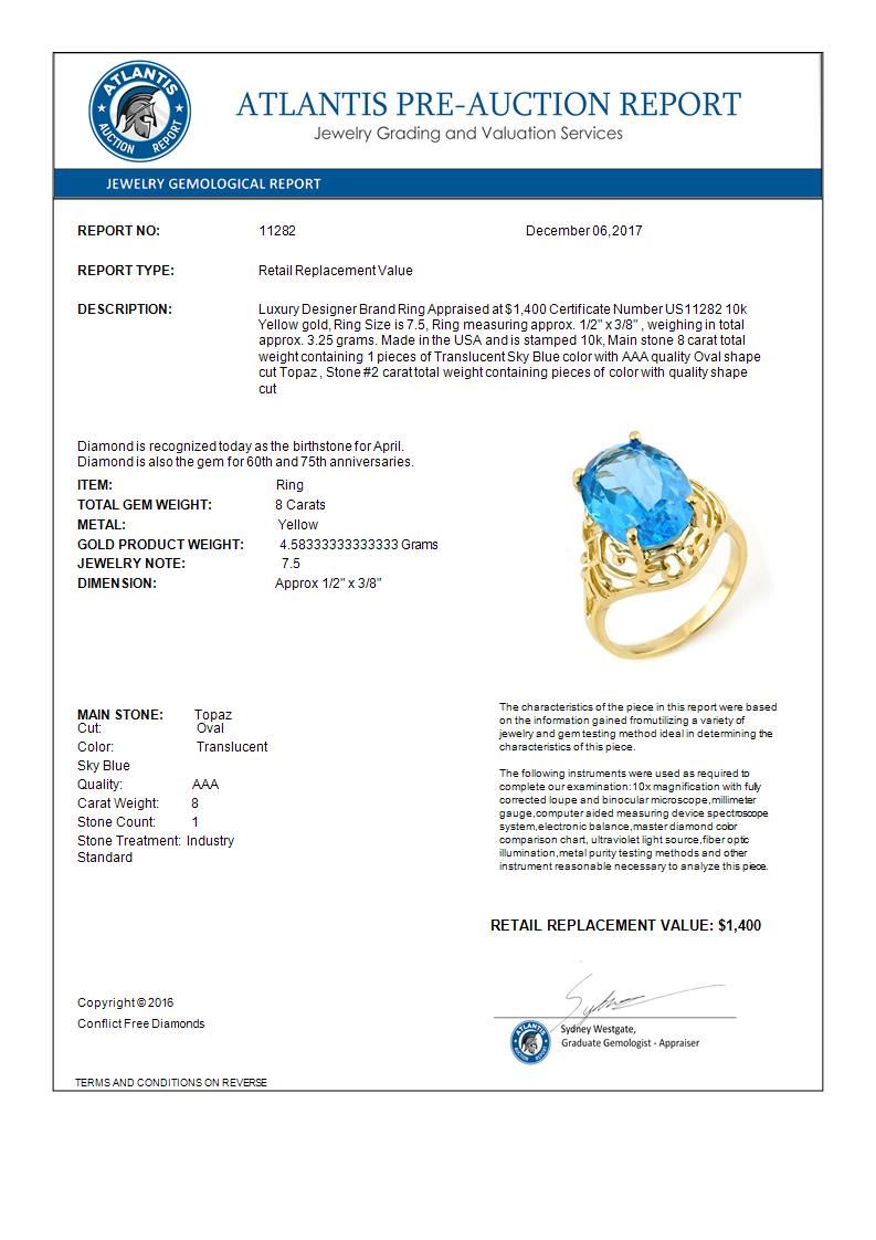 REF-21H3A -11282 ---- 8.0 CTW Blue Topaz Ring 10K Yellow Gold ---- Luxury Designer Brand Ring Appraised at $1,400 Certificate Number US11282 10k Yellow gold, Ring Size is 7.5, Ring measuring approx. 1/2" x 3/8" , weighing in total approx. 3.25 grams. Made in the USA and is stamped 10k, Main stone 8 carat total weight containing 1 pieces of Translucent Sky Blue color with AAA quality Oval shape cut Topaz , Stone #2 carat total weight containing pieces of color with quality shape cut