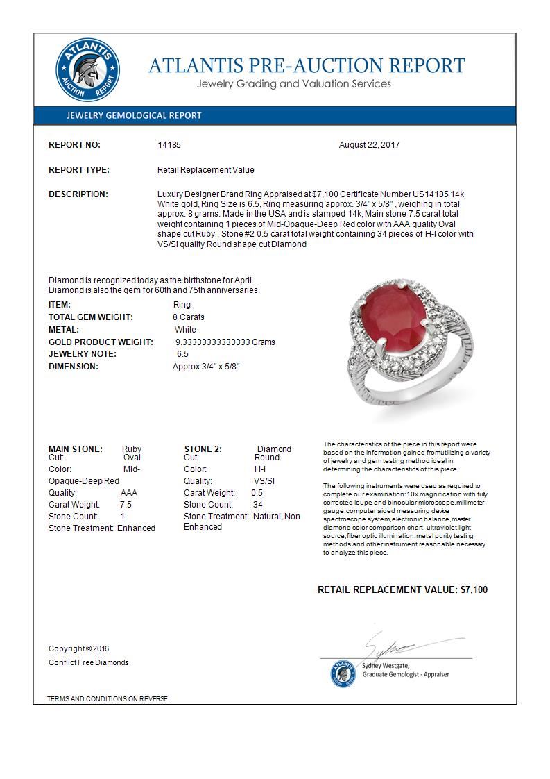 14185 - REF-92W4H ---- 8.0 CTW Ruby & Diamond Ring 14K White Gold ---- Luxury Designer Brand Ring Appraised at $7,100 Certificate Number US14185 14k White gold, Ring Size is 6.5, Ring measuring approx. 3/4" x 5/8" , weighing in total approx. 8 grams. Made in the USA and is stamped 14k, Main stone 7.5 carat total weight containing 1 pieces of Mid-Opaque-Deep Red color with AAA quality Oval shape cut Ruby , Stone #2 0.5 carat total weight containing 34 pieces of H-I color with VS/SI quality Round shape cut Diamond
