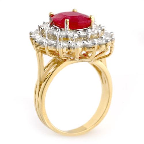 8.0 CTW Ruby & Diamond Ring 14K Yellow Gold ---- Luxury Designer Brand Ring Appraised Retail Price at $17,700 ---- SKU Number US13270 14k Yellow gold Ring Size is 7.5, Ring measuring approx. 3/4" x 5/8" , weighing in total approx. 8.5 grams. Made in the USA and is stamped 14k, Main stone 5 carat total weight containing 1 pieces of Mid-Opaque-Deep Red color with AAA quality Oval shape cut Ruby , Stone #2 3 carat total weight containing 30 pieces of H-I color with VS/SI quality Round shape cut
