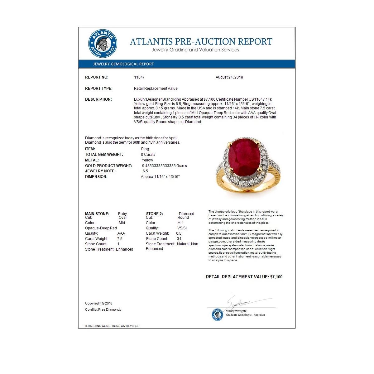REF-92M4H -11647 ---- 8.0 CTW Ruby & Diamond Ring 14K Yellow Gold ---- Luxury Designer Brand Ring Appraised at $7,100 Certificate Number US11647 14k Yellow gold, Ring Size is 6.5, Ring measuring approx. 11/16" x 13/16" , weighing in total approx. 8.15 grams. Made in the USA and is stamped 14k, Main stone 7.5 carat total weight containing 1 pieces of Mid-Opaque-Deep Red color with AAA quality Oval shape cut Ruby , Stone #2 0.5 carat total weight containing 34 pieces of H-I color with VS/SI quality Round shape cut Diamond
