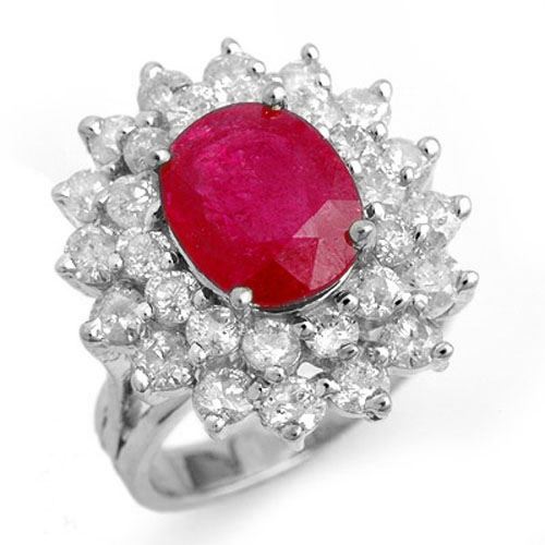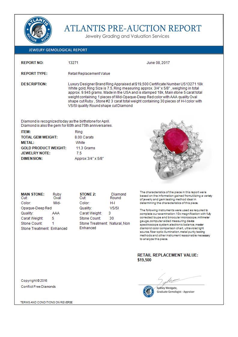 8.0 CTW Ruby & Diamond Ring 18K White Gold ---- Luxury Designer Brand Ring Appraised Retail Price at $19,500 ---- SKU Number US13271 18k White gold Ring Size is 7.5, Ring measuring approx. 3/4" x 5/8" , weighing in total approx. 9.945 grams. Made in the USA and is stamped 18k, Main stone 5 carat total weight containing 1 pieces of Mid-Opaque-Deep Red color with AAA quality Oval shape cut Ruby , Stone #2 3 carat total weight containing 30 pieces of H-I color with VS/SI quality Round shape cut