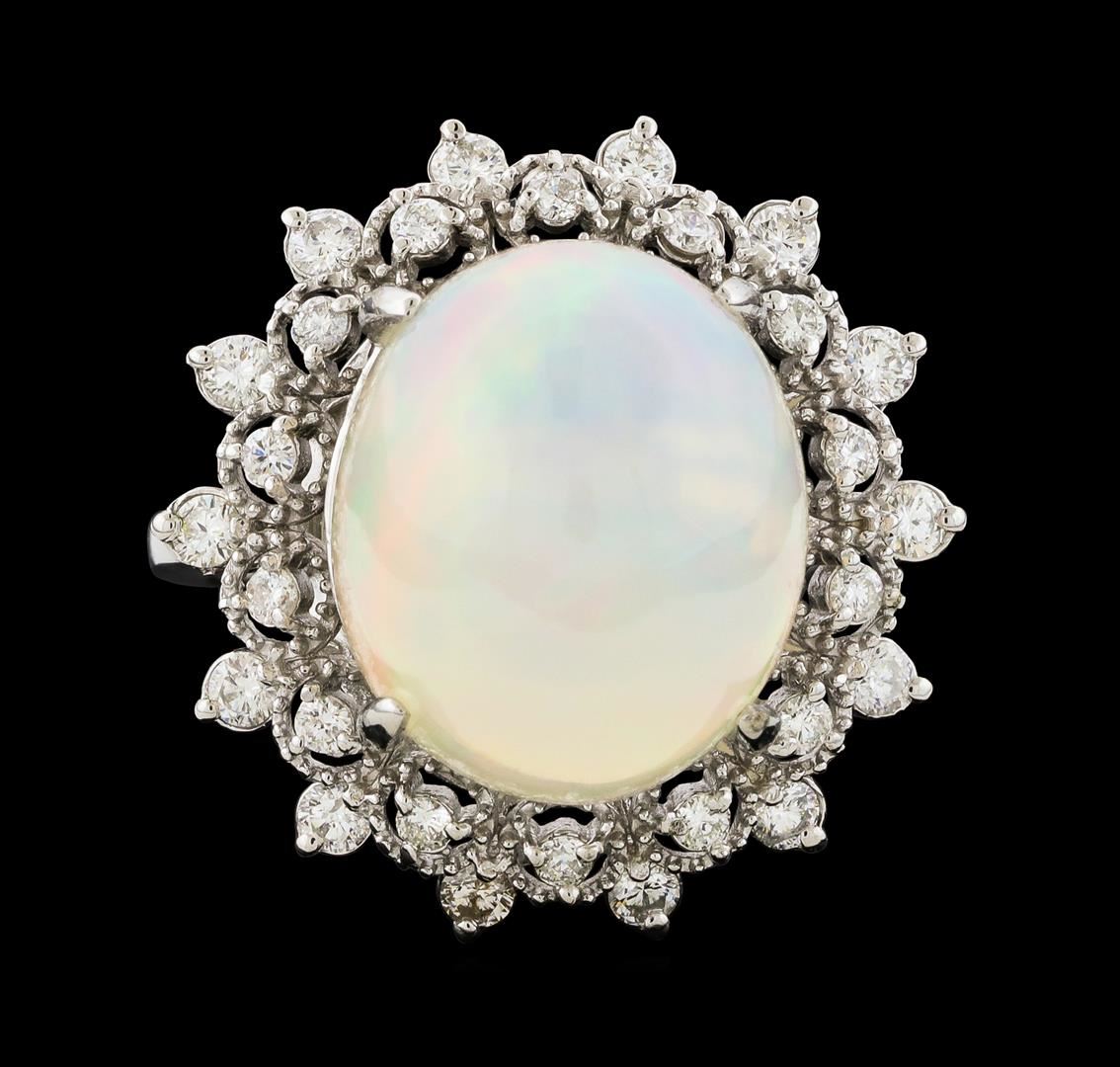 One Opal and Diamond Ring featuring: 14KT White Gold with a total weight of 4.67 grams, One Opal stone with a total weight of 8.00ct, and 28 Diamonds with a total weight of 0.52ctw.