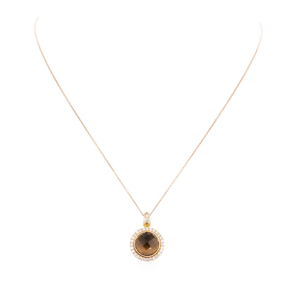 One pendant with chain featuring: 18KT rose gold weighing 7.7 grams containing one checkerboard cabochon cut smokey quartz weighing 8.00ct and diamonds weighing 0.38ctw. The attached chain measures sixteen inches in length.