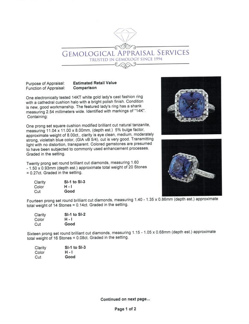 One electronically tested 14KT white gold lady's cast fashion ring with a cathedral cushion halo with a bright polish finish. The featured lady's ring has a shank measuring 2.54 millimeters wide. Identified with markings of '14K'. Condition is new, good workmanship. Containing: One prong set square cushion modified brilliant cut natural tanzanite, measuring 11.04 x 11.00 x 8.00mm, (depth est.) 5%. bulge factor, approximate weight of 8.00ct., clarity is eye clean, medium, moderately strong, violetish blue color, (GIA vB 5/4), cut is very good. Transmitting light with no distortion, transparent. Colored gemstones are presumed to have been subjected to commonly used enhancement processes. Graded in the setting. Twenty prong set round brilliant cut diamonds, measuring 1.60 - 1.50 x 0.93mm (depth est.) approximate total weight of 20 Stones = 0.27ct. Graded in the setting. Clarity SI-1 to SI-3. Color: H - I Cut Good Fourteen prong set round brilliant cut diamonds, measuring 1.40 - 1.35 x 0.86mm (depth est.) approximate total weight of 14 Stones = 0.14ct. Graded in the setting. Clarity SI-1 to SI-2. Color: H - I Cut Good Sixteen prong set round brilliant cut diamonds, measuring 1.15 - 1.05 x 0.68mm (depth est.) approximate total weight of 16 Stones = 0.08ct. Graded in the setting. Clarity SI-1 to SI-3. Color: H - I Cut Good. Total Weight of Colored Stones 8.00ct.. Total Weight of Diamonds 0.49ct.. Total Weight of Ring 8.60gm. GAS Appraised at $13,060.00.