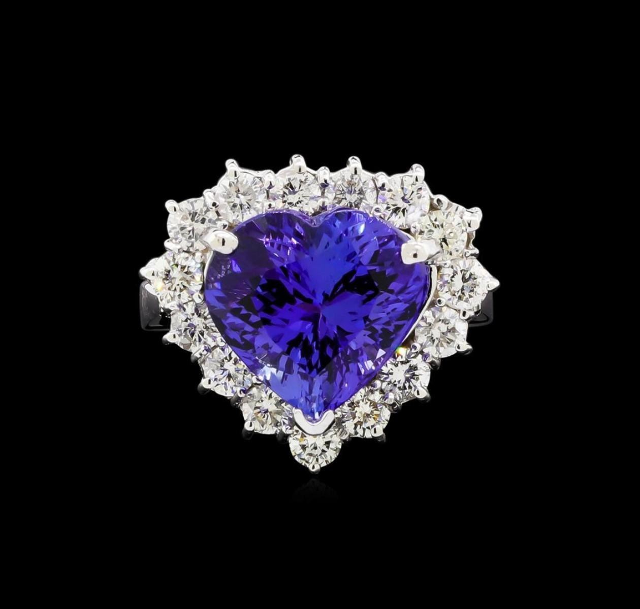 One electronically tested 14KT white gold lady's combination cast & assembled heart shape ring with a basket halo with a bright polish finish. The featured lady's ring has a shank measuring 2.64 millimeters wide. Identified with markings of "14K". Condition is new, good workmanship. Containing: One prong set heart modified brilliant cut natural tanzanite, measuring 12.20 x 13.00 x 8.37mm, approximate weight of 8.00ct., clarity is eye clean, type I, medium dark, moderately strong, violetish blue color, (GIA vB 6/4), cut is very good. Transmitting light with no distortion, transparent. Colored gemstones are presumed to have been subjected to commonly used enhancement processes. Graded in the setting. Fifteen prong set round brilliant cut diamonds, measuring 3.10 - 3.00 x 1.89mm (depth est.) approximate total weight of 15 Stones = 1.60ct. Graded in the setting. Clarity: SI-1 to I-1. Color: H - J. Cut Good. Total Weight of Colored Stones 8.00ct. Total Weight of Diamonds 1.60ct. Total Weight of Ring 11.10gm. GAS Appraised.