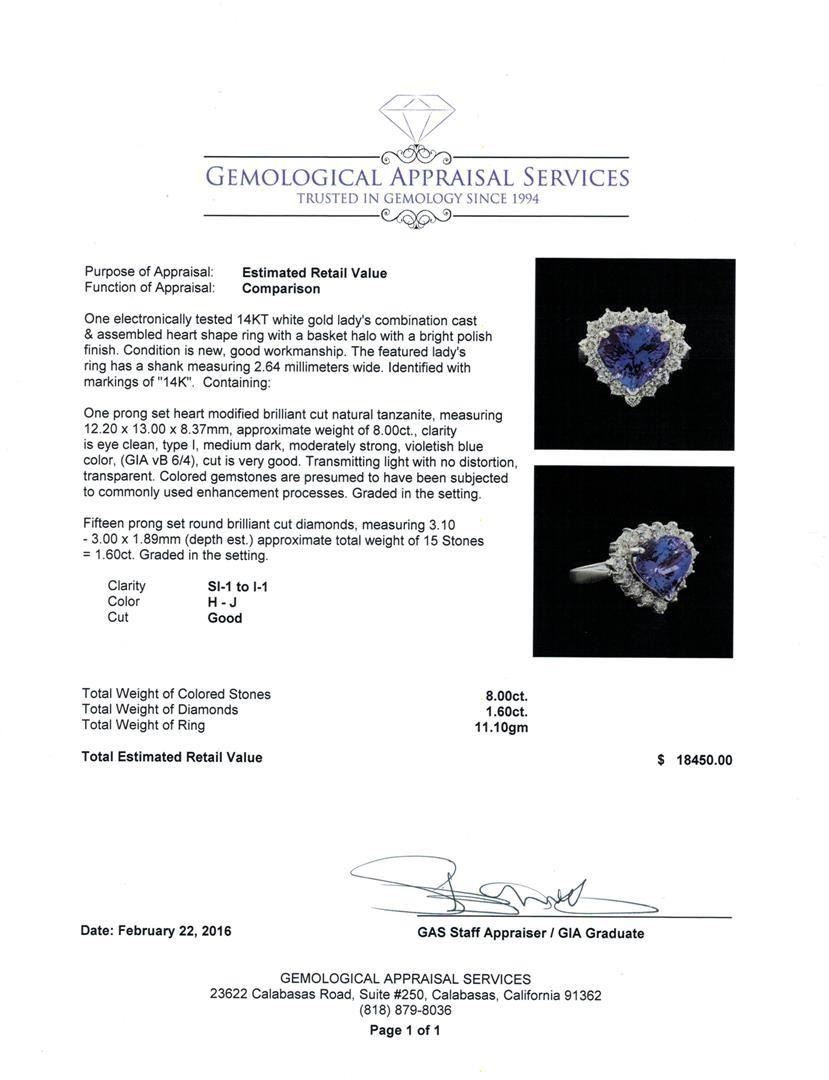 One electronically tested 14KT white gold lady's combination cast & assembled heart shape ring with a basket halo with a bright polish finish. The featured lady's ring has a shank measuring 2.64 millimeters wide. Identified with markings of "14K". Condition is new, good workmanship. Containing: One prong set heart modified brilliant cut natural tanzanite, measuring 12.20 x 13.00 x 8.37mm, approximate weight of 8.00 ct., clarity is eye clean, type I, medium dark, moderately strong, violetish blue color, (GIA vB 6/4), cut is very good. Transmitting light with no distortion, transparent. Colored gemstones are presumed to have been subjected to commonly used enhancement processes. Graded in the setting. Fifteen prong set round brilliant cut diamonds, measuring 3.10 - 3.00 x 1.89mm (depth est.) approximate total weight of 15 Stones = 1.60 ct. Graded in the setting. Clarity: SI-1 to I-1. Color: H - J. Cut Good. Total Weight of Colored Stones 8.00 ct. Total Weight of Diamonds 1.60 ct. Total Weight of Ring 11.10gm. GAS Appraised.