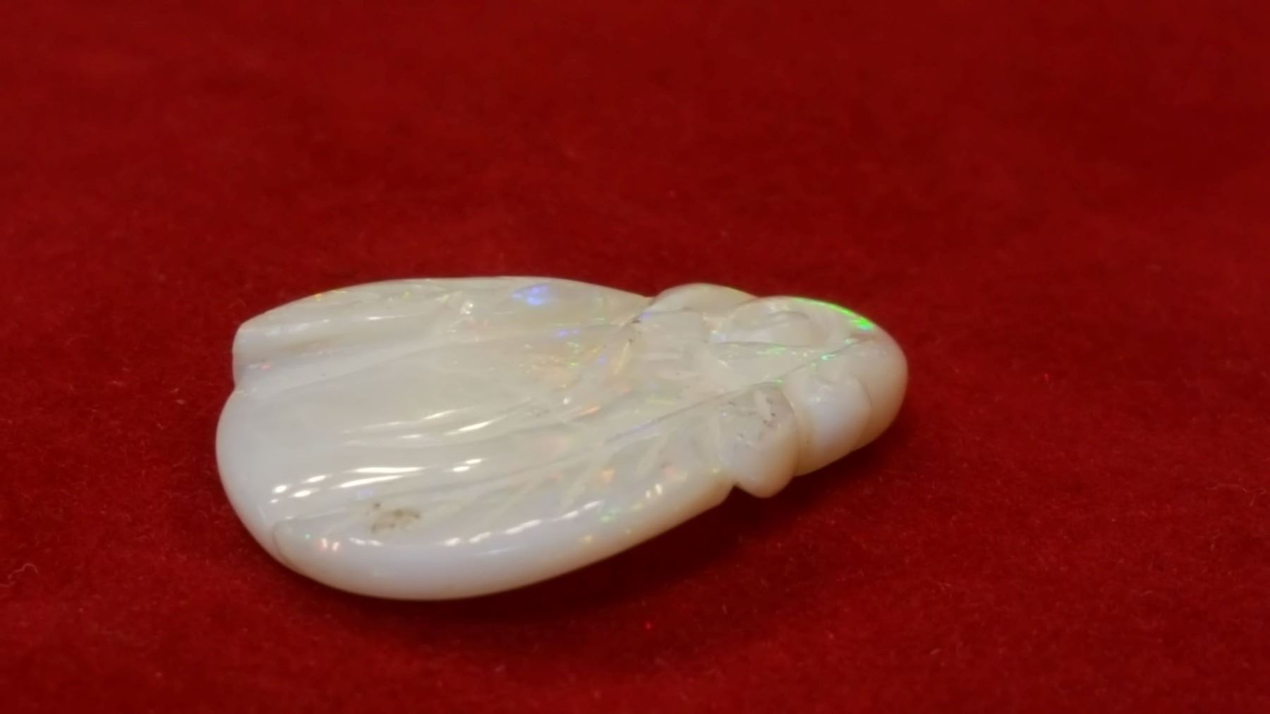 Stunning untreated 8 ct hand carved welo opal leaf. This all natural opulent opal has an incredibly large size with rare indigo and blue green play of color complimented by but not limited to dazzling flashes of gold, green red ,orange and pinks. It has a mirror like finish through out a translucant body. It displays a ravishing mixed chaff/harlequine patterns. Already has drill hole.