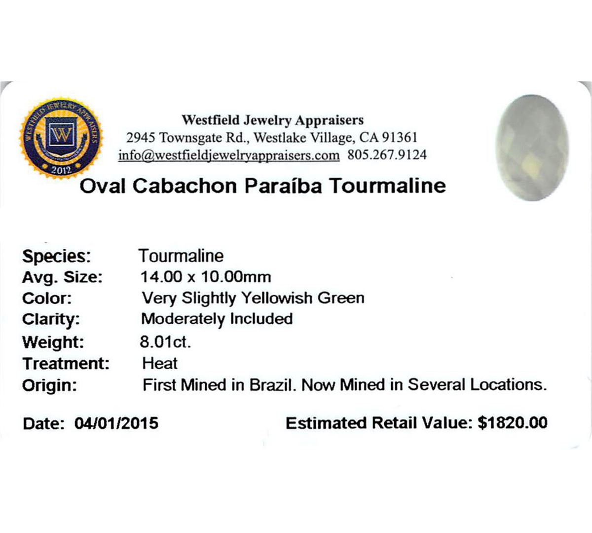 One oval cabochon cut natural Paraiba tourmaline exact weight 8.01ct., clarity is moderately included, cut is good. Westfield Appraised at $1,820.00.
