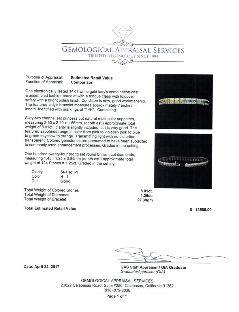 One electronically tested 14KT white gold lady's combination cast & assembled fashion bracelet with a tongue clasp with foldover safety with a bright polish finish. The featured lady's bracelet measures approximately 7 inches in length. Identified with markings of '14K'. Condition is new, good workmanship. Containing: Sixty-two channel set princess cut natural multi-color sapphires, measuring 2.50 x 2.40 x 1.56mm, (depth est.) approximate total weight of 8.01ct., clarity is slightly included, cut is very good. The featured sapphires range in color from pink to violetish pink to blue to green to yellow to orange. Transmitting light with no distortion, transparent. Colored gemstones are presumed to have been subjected to commonly used enhancement processes. Graded in the setting. One Hundred Twenty-Four prong set round brilliant cut diamonds, measuring 1.45 - 1.35 x 0.84mm (depth est.) approximate total weight of 124 Stones = 1.25ct. Graded in the setting. Color H - I Clarity SI-1 to I-1 Cut Good. Total Weight of Colored Stones 8.01ct.. Total Weight of Diamonds 1.25ct.. Total Weight of Bracelet 27.30gm GAS Appraised at $13585.00. GAS Appraised at $13,585.00.