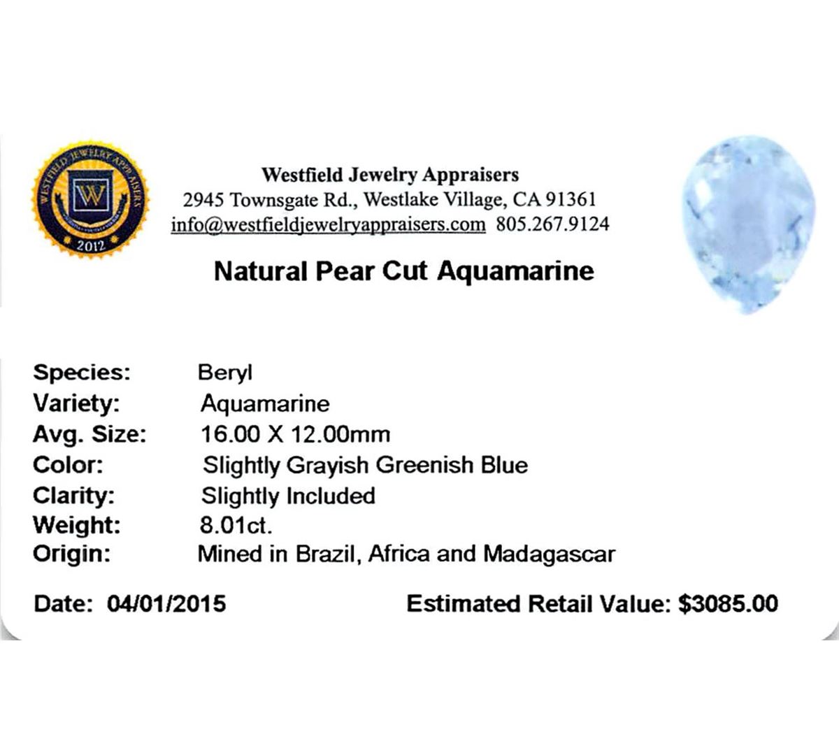 One pear cut natural aquamarine exact weight 8.01ct., clarity is slightly included, type I, medium, slightly grayish, very slightly greenish blue color, (GIA vslgB 5/2), cut is good. Westfield Appraised at $3,085.00.