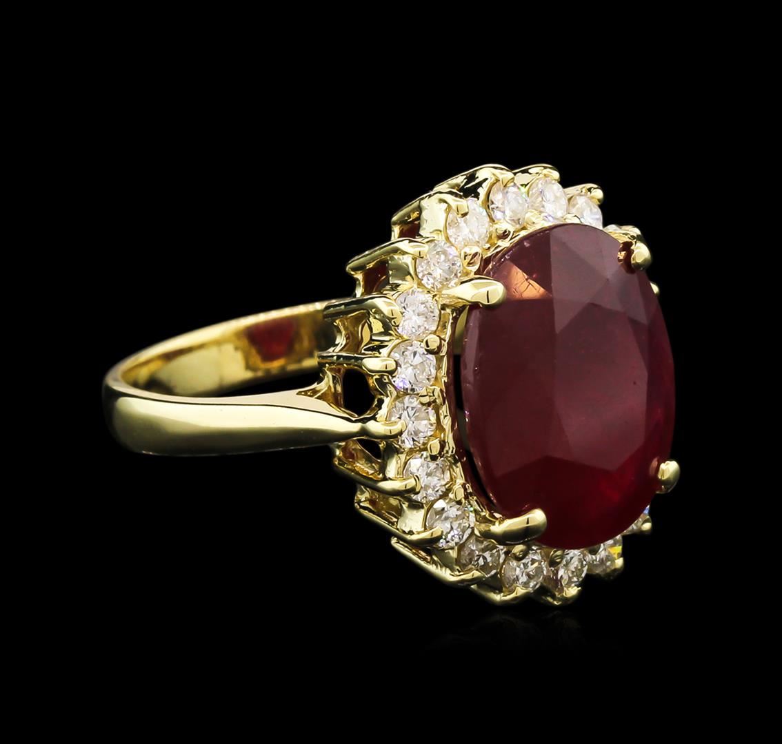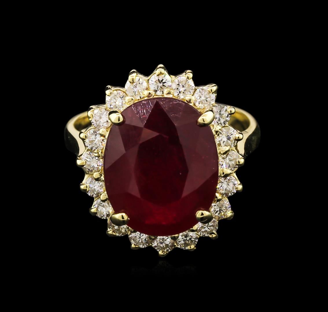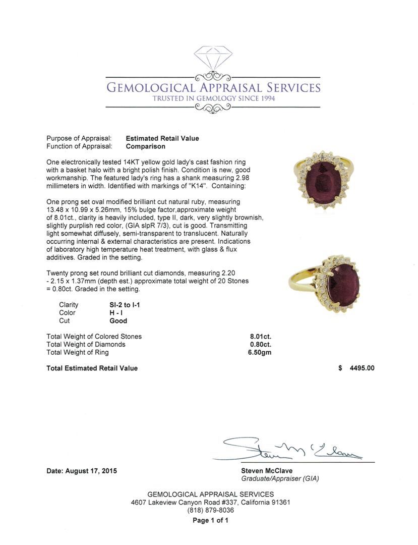 One electronically tested 14KT yellow gold lady's cast fashion ring with a basket halo with a bright polish finish. The featured lady's ring has a shank measuring 2.98 millimeters in width. Identified with markings of "K14". Condition is new, good workmanship. Containing: One prong set oval modified brilliant cut natural ruby, measuring 13.48 x 10.99 x 5.26mm, 15% bulge factor, approximate weight of 8.01ct., clarity is heavily included, type II, dark, very slightly brownish, slightly purplish red color, (GIA slpR 7/3), cut is good. Transmitting light somewhat diffusely, semi-transparent to translucent. Naturally occurring internal & external characteristics are present. Indications of laboratory high temperature heat treatment, with glass & flux additives. Graded in the setting. Twenty prong set round brilliant cut diamonds, measuring 2.20 - 2.15 x 1.37mm (depth est.) approximate total weight of 20 Stones = 0.80ct. Graded in the setting. Clarity: SI-2 to I-1. Color: H - I. Cut Good. Total Weight of Colored Stones 8.01ct. Total Weight of Diamonds 0.80ct. Total Weight of Ring 6.50gm. GAS Appraised at $4,495.00.