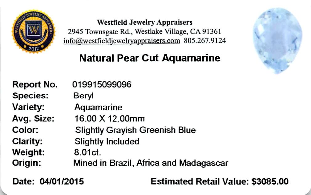 One pear cut natural aquamarine exact weight 8.01ct., clarity is slightly included, type I, medium, slightly grayish, very slightly greenish blue color, (GIA vslgB 5/2), cut is good. Westfield Appraised at $3,085.00.