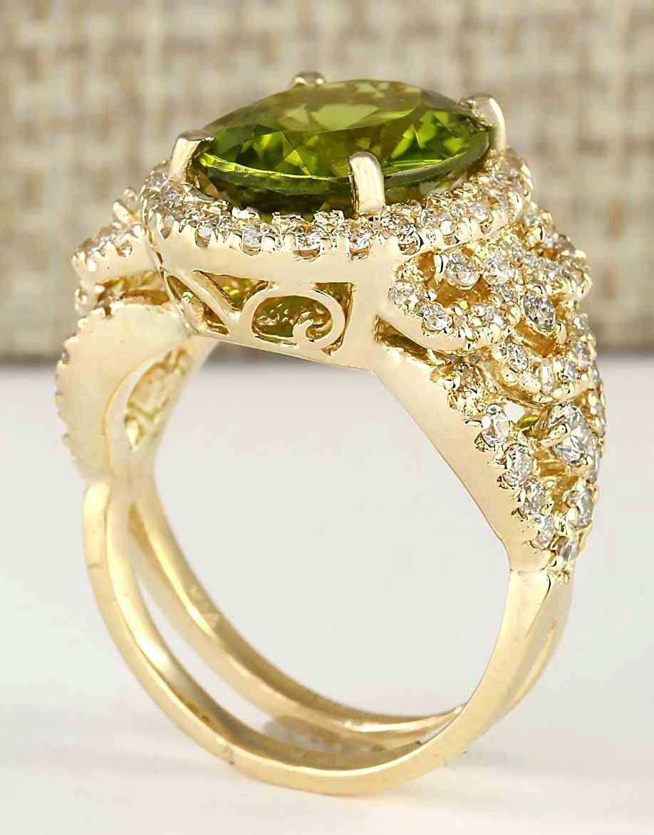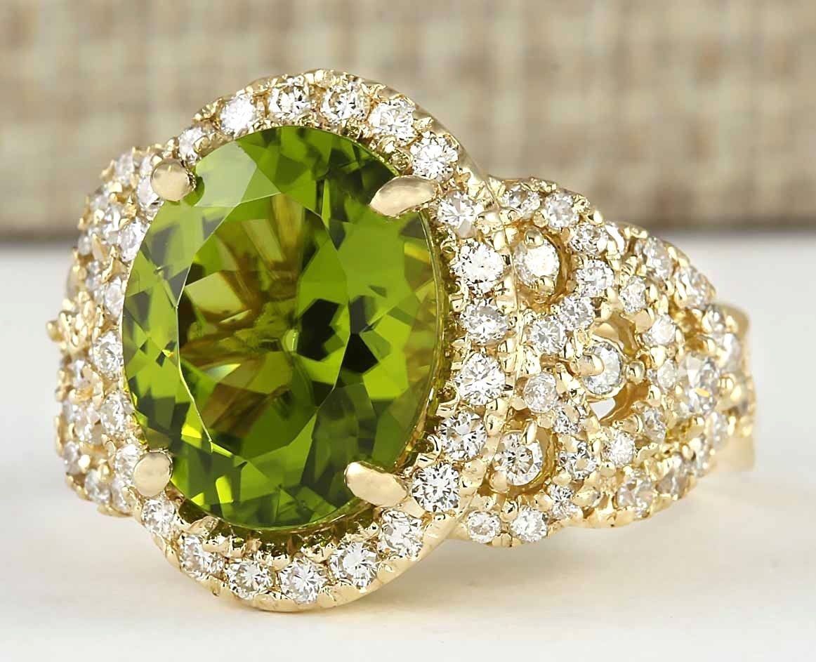 Stamped: 14K Ring Size: 7.25 Total Ring Weight: 10 Grams Diamond Weight: Total natural diamond weight is 1.50carat. SI1-SI2 clarity / G-H color Gemstone Weight: Total Natural Peridot Weight is 6.52ctw (Measures: 12.90x11.30mm) Main Stone Color: Green Face Measures: 17.37x14.60mm SKU: [704175]
