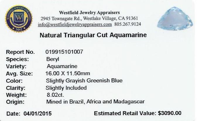 One triangle cut natural aquamarine exact weight 8.02ct., clarity is slightly included, type I, medium, very slightly grayish, very slightly greenish blue color, (GIA vslgB 5/3), cut is good. Westfield Appraised at $3,090.00.