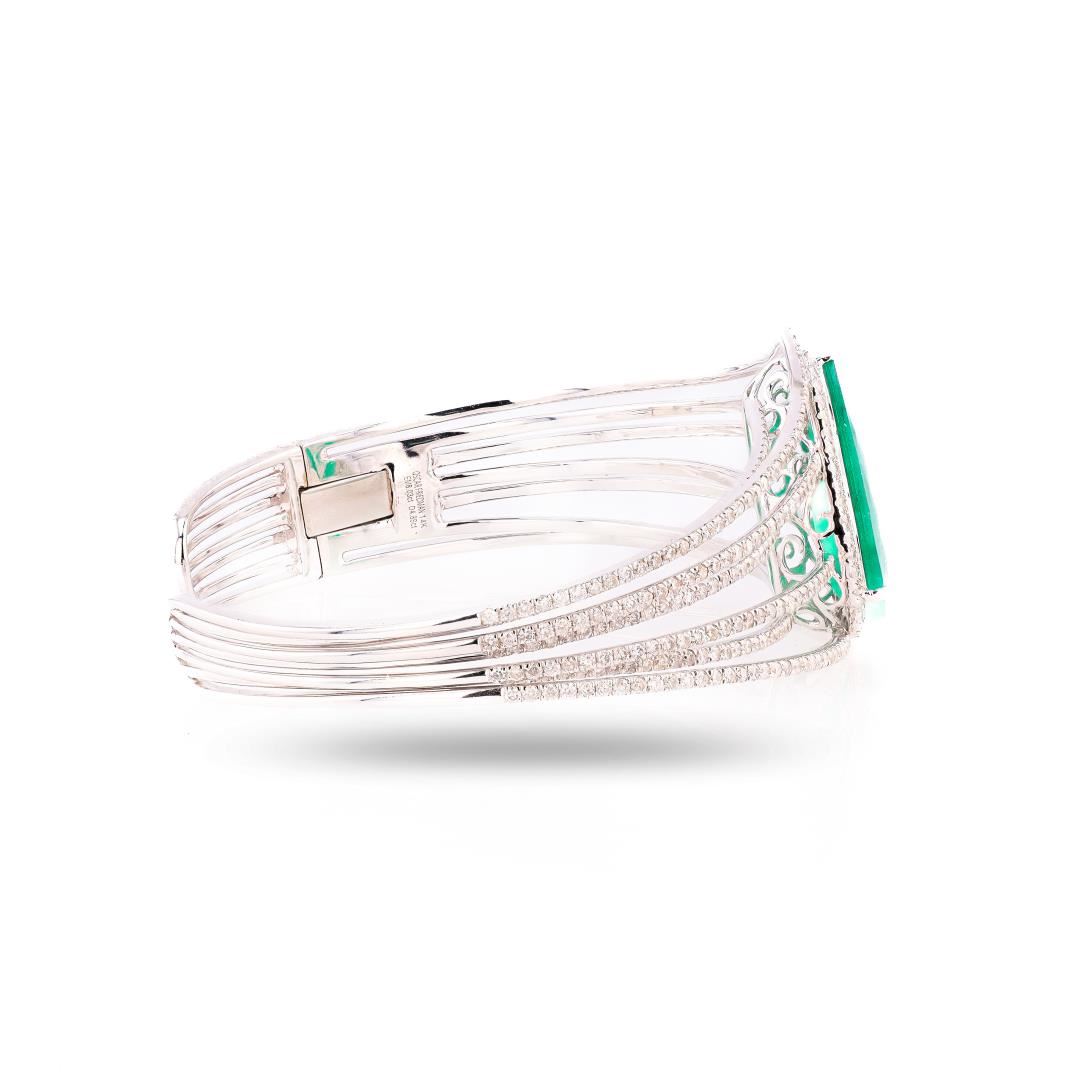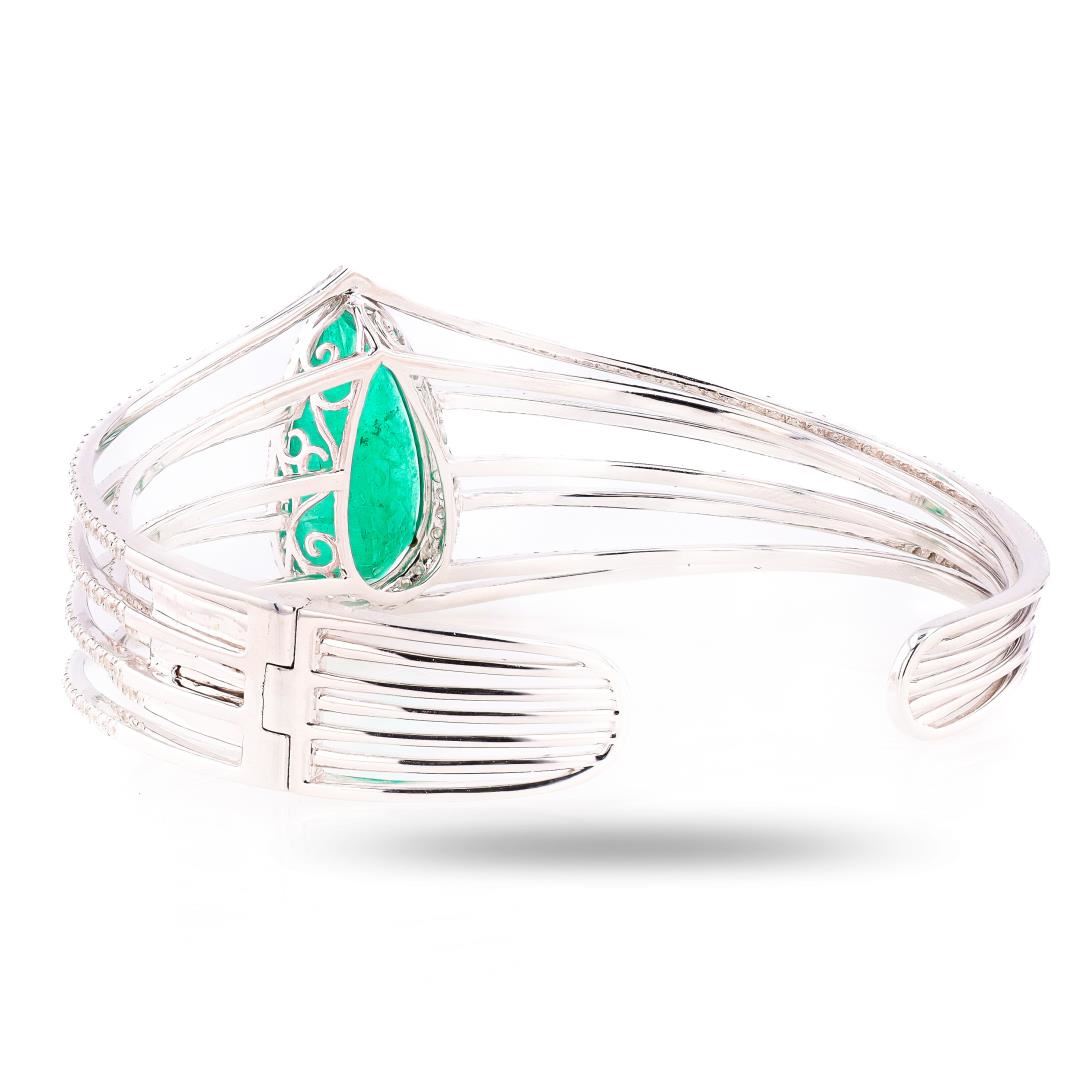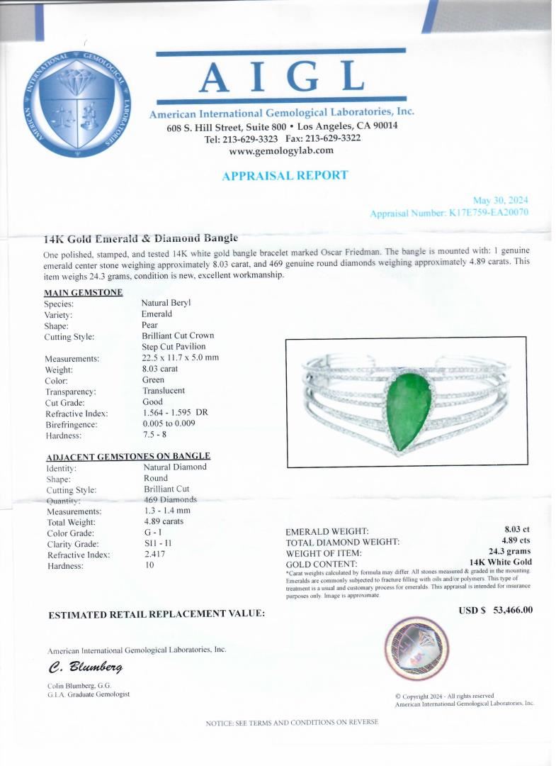 One polished, stamped, and tested 14K white gold bangle bracelet marked Oscar Friedman. The bangle is mounted with: 1 genuine emerald center stone weighing approximately 8.03 carat, and 469 genuine round diamonds weighing approximately 4.89 carats. This item weighs 24.3 grams, condition is new. excellent workmanship. #MAIN GEMSTONE# Species: Natural Beryl Variety: Emerald Shape: Pear Cutting Style: Brilliant Cut Crown, Step Cut Pavilion Measurements: 22.5 x 11.7 x 5.0mm Weight: 8.03 carat Color: Green Transparency: Translucent Cut Grade: Good Refractive Index: 1.564 - 1.595 DR Birefringence: 0.005 to 0.009 Hardness: 7.5 - 8 #ADJACENT GEMSTONES ON BANGLE# Identity: Natural Diamond Shape: Round Cutting Style: Brilliant Cut Quantity: 469 Diamonds Measurements: 1.3 - 1.4mm Total Weight: 4.89 carats Color Grade: G-I Clarity Grade: SI1-I1 Refractive Index: 2.417 Hardness: 10 #EMERALD WEIGHT: 8.03 ct TOTAL DIAMOND WEIGHT: 4.89 cts WEIGHT OF ITEM: 24.3 grams GOLD CONTENT: 14K White Gold Size: 7