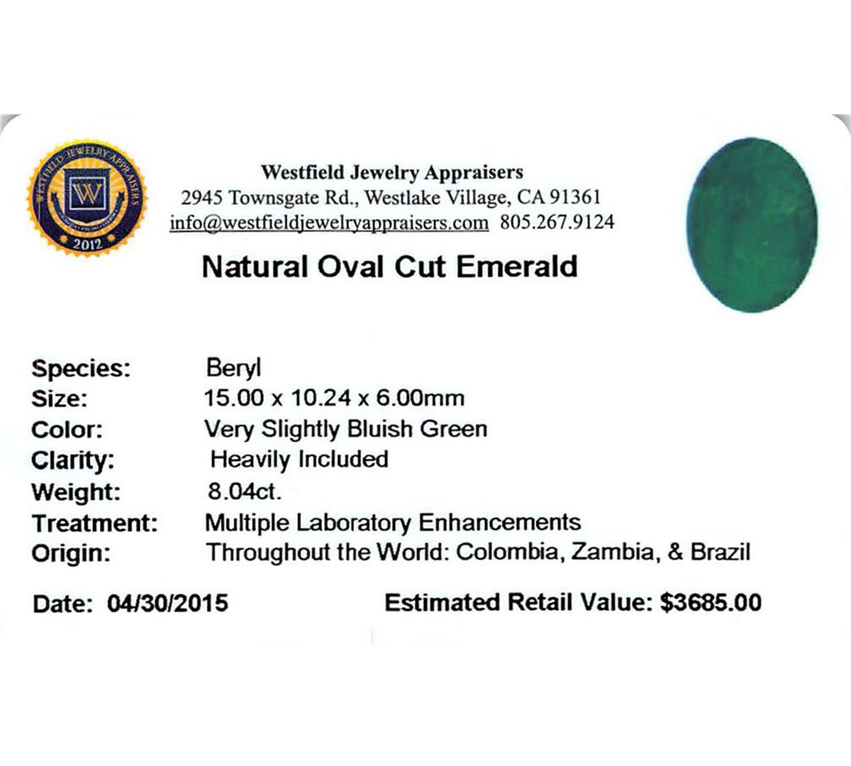 One oval cut natural emerald, measuring 15.00 x 10.24 x 6.00mm, exact weight 8.04ct., clarity is heavily included, type III, medium dark, very slightly grayish, very slightly bluish green color, (GIA vslbG 6/3), cut is good. Westfield Appraised at $3,685.00.