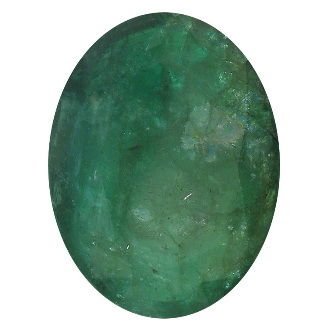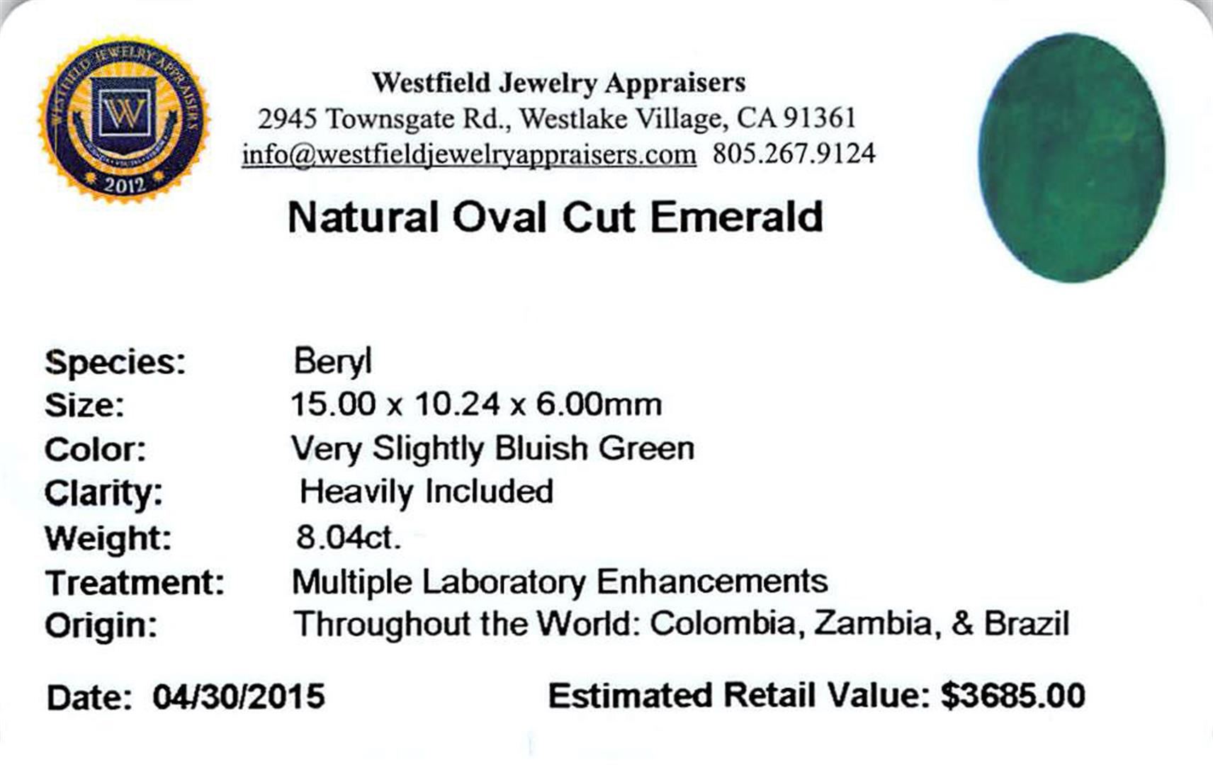 One oval cut natural emerald, measuring 15.00 x 10.24 x 6.00mm, exact weight 8.04ct., clarity is heavily included, type III, medium dark, very slightly grayish, very slightly bluish green color, (GIA vslbG 6/3), cut is good. Westfield Appraised.