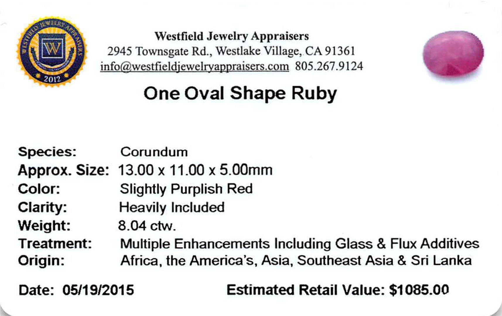 One oval mixed cut natural ruby, measuring 13.00 x 11.00 x 5.00mm, exact weight 8.04ct., clarity is heavily included, type II, medium dark, very slightly brownish, slightly purplish red color, (GIA slpR 6/3), cut is good. Westfield Appraised at $1,085.00.