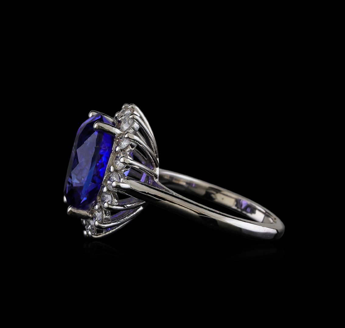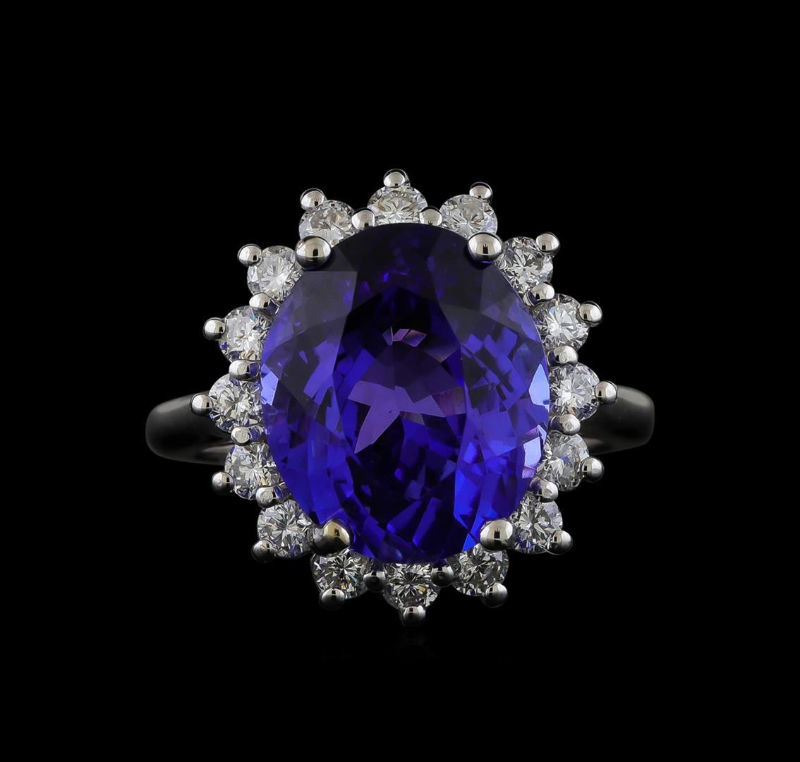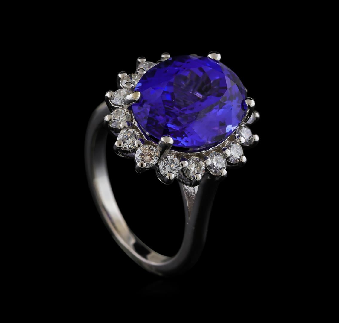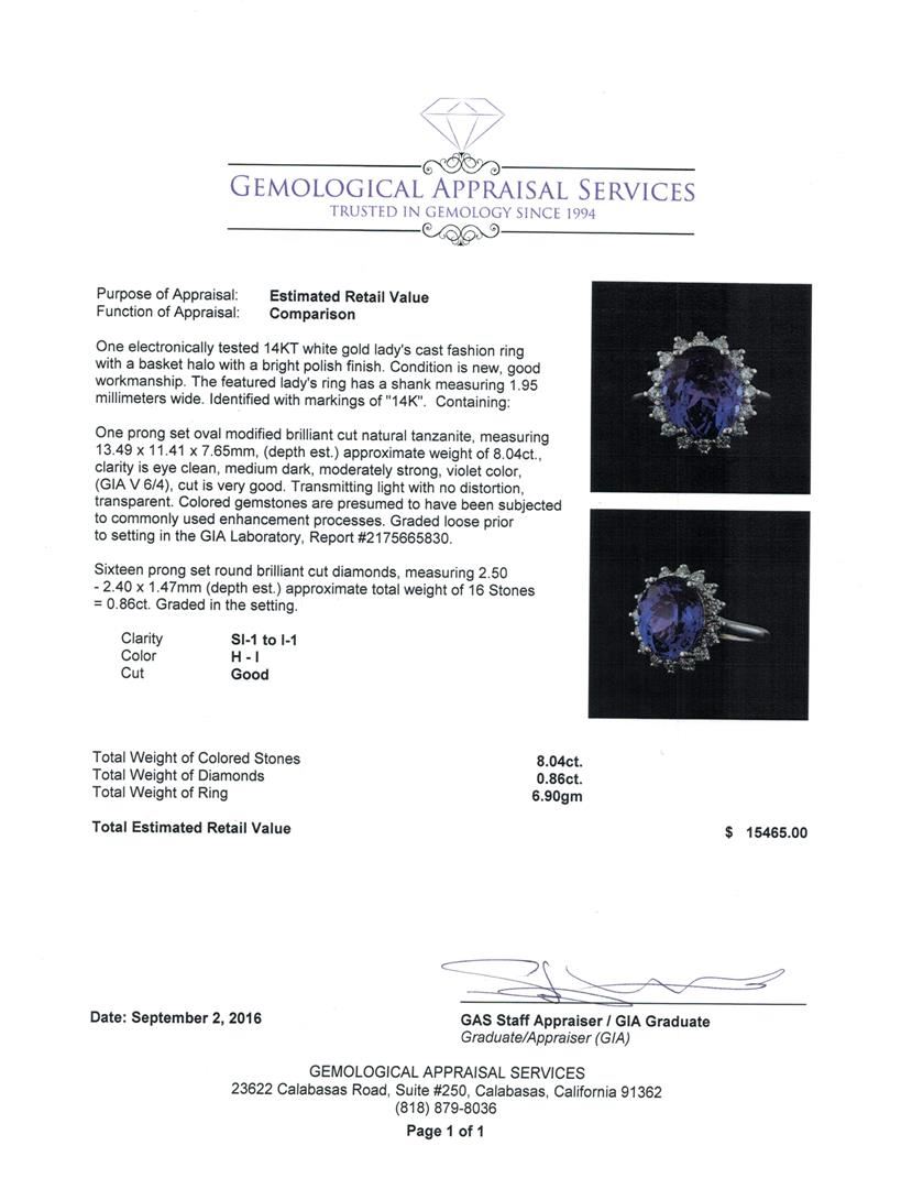 One electronically tested 14KT white gold lady's cast fashion ring with a basket halo with a bright polish finish. The featured lady's ring has a shank measuring 1.95 millimeters wide. Identified with markings of '14K'. Condition is new, good workmanship. Containing: One prong set oval modified brilliant cut natural tanzanite, measuring 13.49 x 11.41 x 7.65mm, (depth est.) approximate weight of 8.04ct., clarity is eye clean, medium dark, moderately strong, violet color, (GIA V 6/4), cut is very good. Transmitting light with no distortion, transparent. Colored gemstones are presumed to have been subjected to commonly used enhancement processes. Graded loose prior to setting in the GIA Laboratory, Report #2175665830. Sixteen prong set round brilliant cut diamonds, measuring 2.50 - 2.40 x 1.47mm (depth est.) approximate total weight of 16 Stones = 0.86ct. Graded in the setting. Clarity SI-1 to I-1. Color: H - I Cut Good. Total Weight of Colored Stones 8.04ct.. Total Weight of Diamonds 0.86ct.. Total Weight of Ring 6.90gm GAS Appraised at $15,465.00.