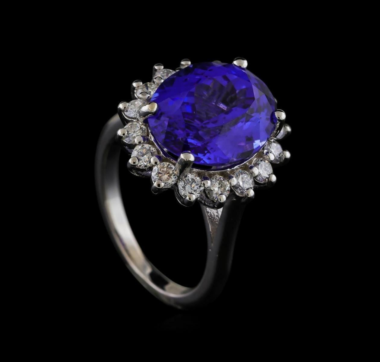 One electronically tested 14KT white gold lady's cast fashion ring with a basket halo with a bright polish finish. The featured lady's ring has a shank measuring 1.95 millimeters wide. Identified with markings of '14K'. Condition is new, good workmanship. Containing: One prong set oval modified brilliant cut natural tanzanite, measuring 13.49 x 11.41 x 7.65mm, (depth est.) approximate weight of 8.04ct., clarity is eye clean, medium dark, moderately strong, violet color, (GIA V 6/4), cut is very good. Transmitting light with no distortion, transparent. Colored gemstones are presumed to have been subjected to commonly used enhancement processes. Graded loose prior to setting in the GIA Laboratory, Report #2175665830. Sixteen prong set round brilliant cut diamonds, measuring 2.50 - 2.40 x 1.47mm (depth est.) approximate total weight of 16 Stones = 0.86ct. Graded in the setting. Clarity SI-1 to I-1. Color: H - I Cut Good. Total Weight of Colored Stones 8.04ct.. Total Weight of Diamonds 0.86ct.. Total Weight of Ring 6.90gm GAS Appraised.