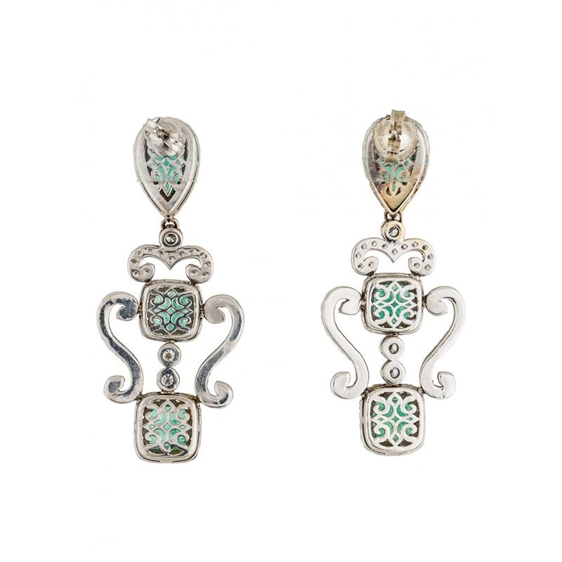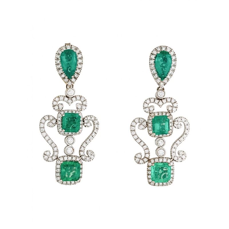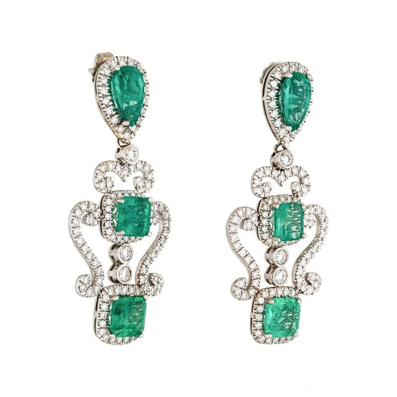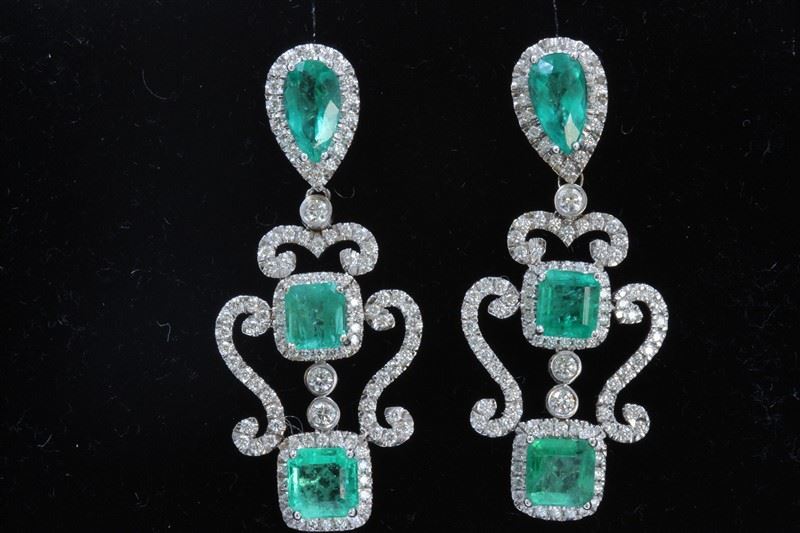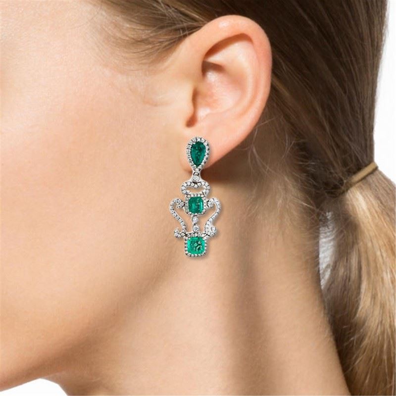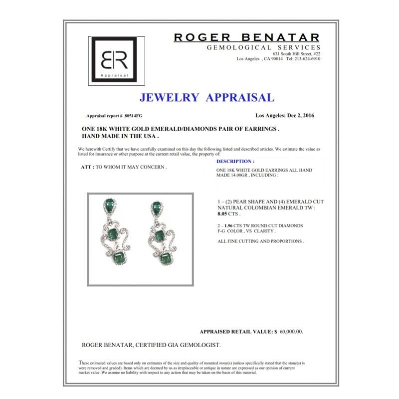 18K White Gold EMERALD EARRING:14 GRAMS / DIAMOND:1.96CT / EMERALD:8.05CT /#GVE1204 **Spectacular 8.05ct pear and Emerald cut Natural Colombian Emerald casts a vibrant green hue. Emerald is known to help one stay centered in the heart's wisdom, to give love to oneself and others. Surrounded by glowing 1.96ct Round Cut Diamonds and twinkling 0.89ct Round Cut Diamonds, they are artfully hand-crafted in 14K white gold, drawing the eye to their bold beauty. these gorgeous earrings are an investment piece: a secure purchase ensuring long life.**