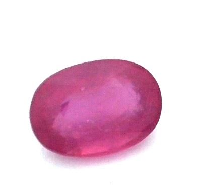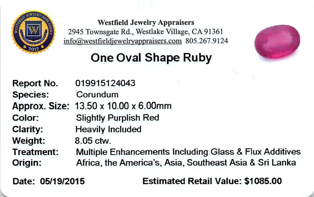 One oval mixed cut natural ruby, measuring 13.50 x 10.00 x 6.00mm, exact weight 8.05ct., clarity is heavily included, type II, medium dark, very slightly brownish, slightly purplish red color, (GIA slpR 6/3), cut is good. Westfield Appraised at $1,085.00.