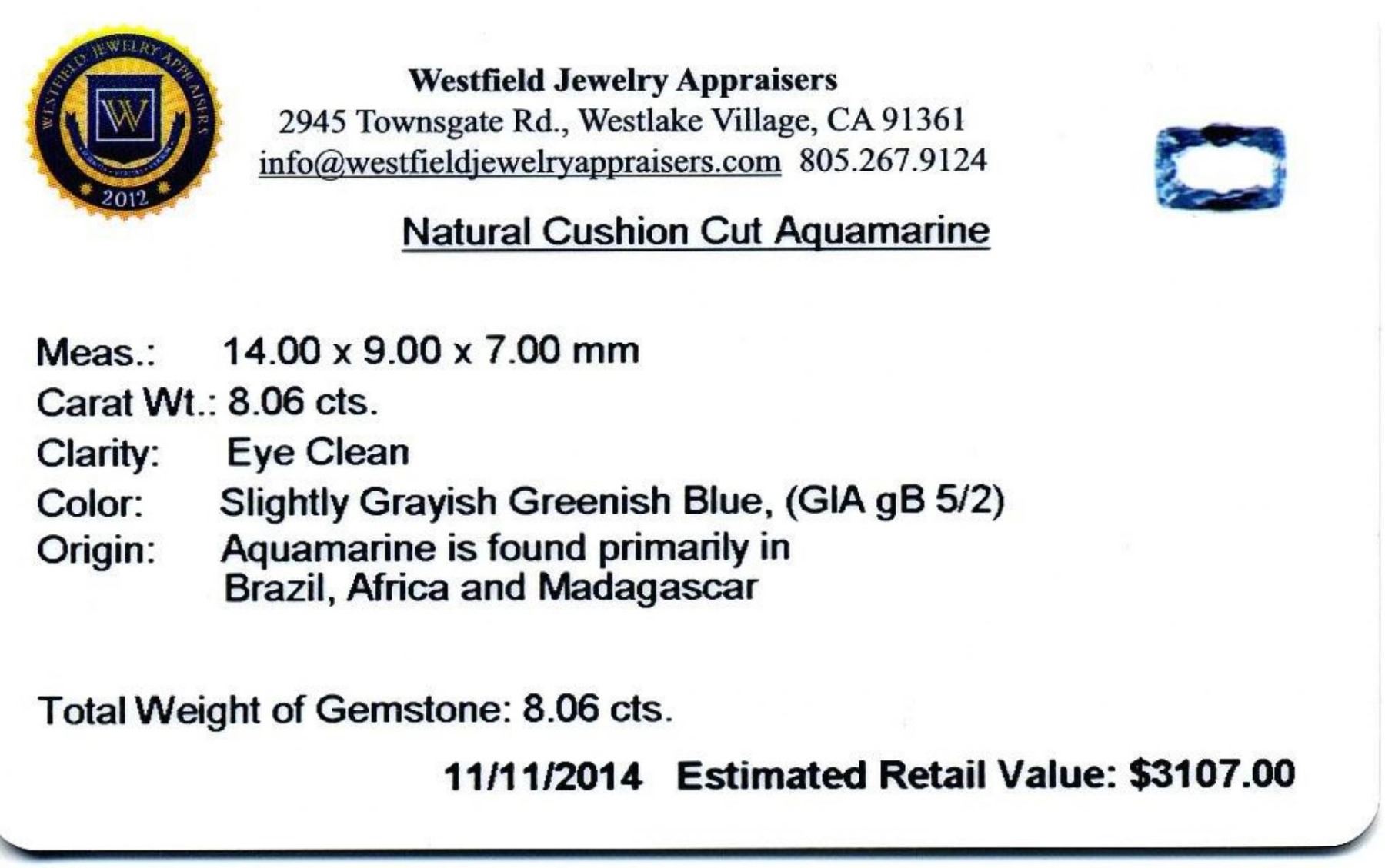 8.06ct. Natural Cushion Cut Aquamarine Westfield Appraised.