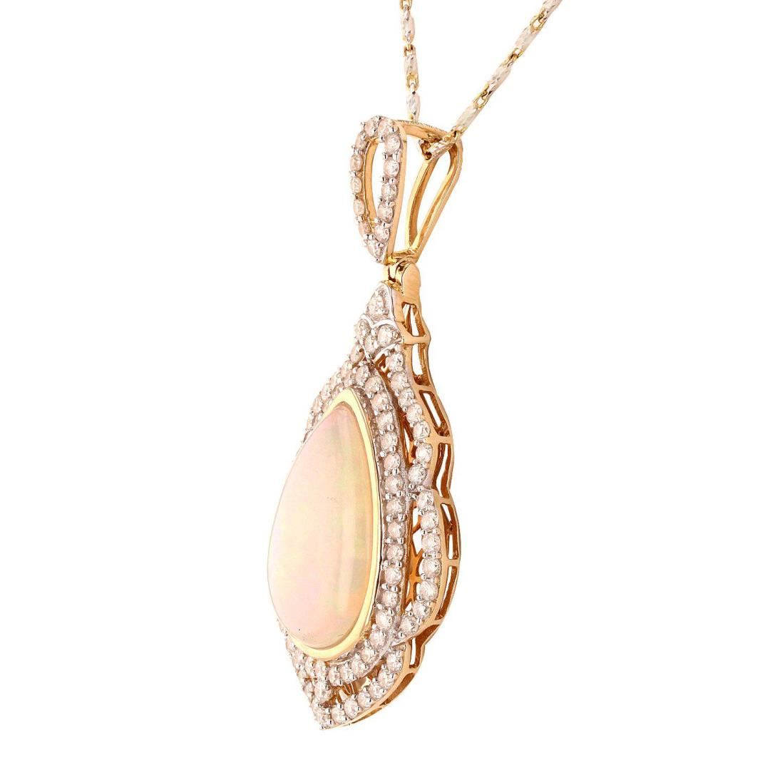One electronically tested 14KT yellow gold ladies cast & assembled opal and diamond pendant with chain. Condition is new, good workmanship. The pendant features an opal cabochon set within stylized diamond bezels, completed by a diamond set bail. The pendant is supported by a twenty inch length 14KT yellow gold designer style chain with rhodium accents, terminating in a lobster claw clasp. Bright polish finish with rhodium accents. Trademark is A. I. Identified with markings of "14K". Containing: One bezel set pear cabochon cut natural ethiopian opal, measuring 20.00 x 14.00 x 6.25mm, approximate weight of 8.06ct. The opal has a bright, red multicolor play of color (fire) in a harlequin pattern a medium dome a good cut no inclusions minor dull spot in its brightness and pattern and is not directional. Graded in the setting. Eighty-seven prong set round brilliant cut diamonds approximate total weight of 87 Stones = 2.15ct. Graded in the setting. Clarity I-1 to 1-2 Color G - I Total Weight of Colored Stones 8.06ct. Total Weight of Diamonds 2.15ct. Total Weight of Pendant With Chain 15.24 g